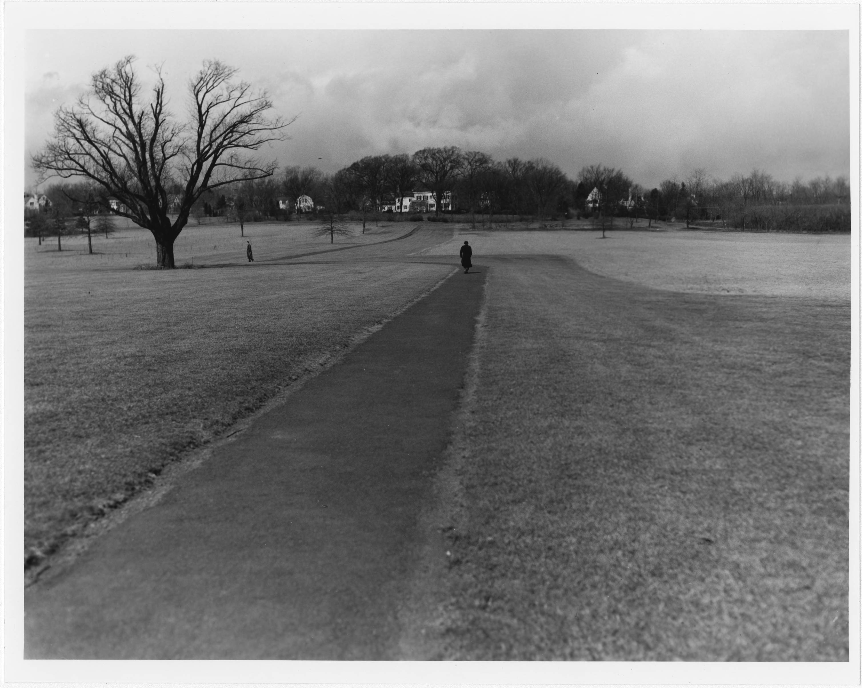 Albert Einstein in the distance walking away from Fuld Hall and across the Institute for Advanced Study campus towards Olden Farm. There is another person in the photograph, also in the distance and not with Einstein, who has not been identified.