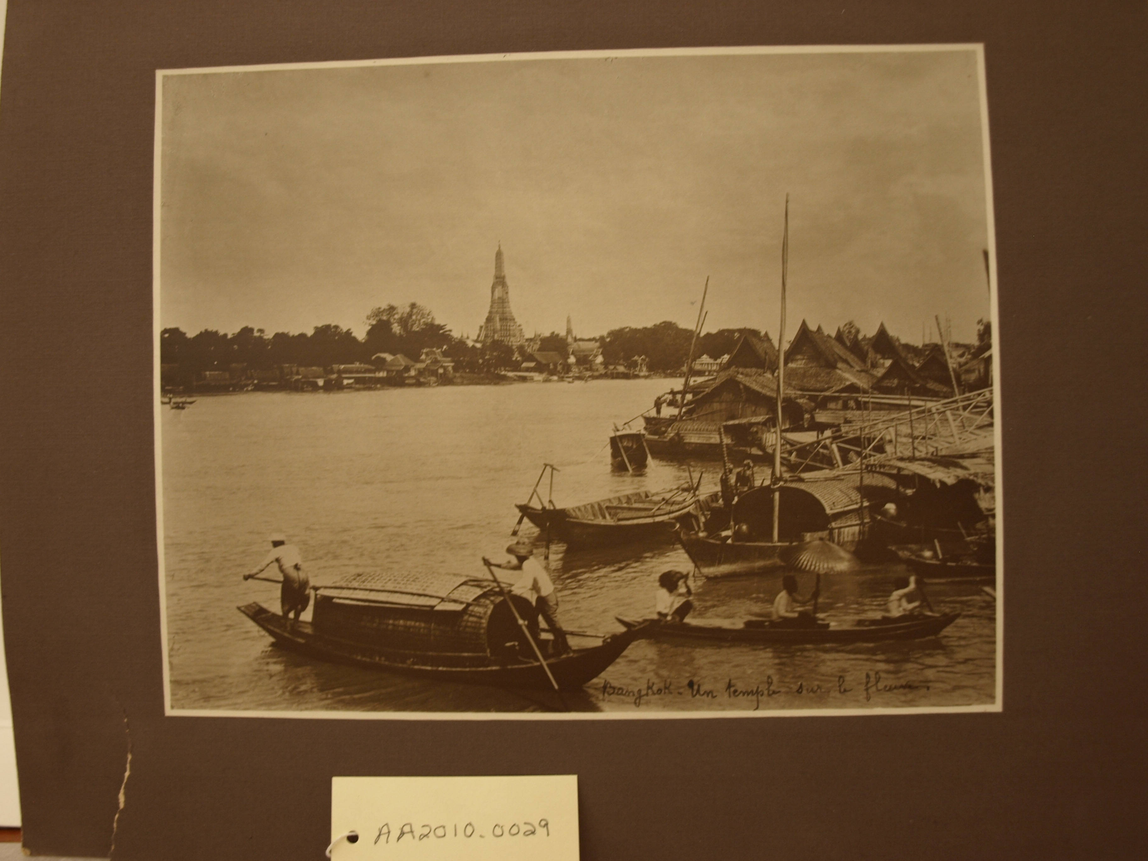 Sepia colored photograph with handwritten notation in lower right "Bangkok - Un temple sur le fleuve". River scene with small boats, people and a temple in the center distance. Mounted on brown cardboard.