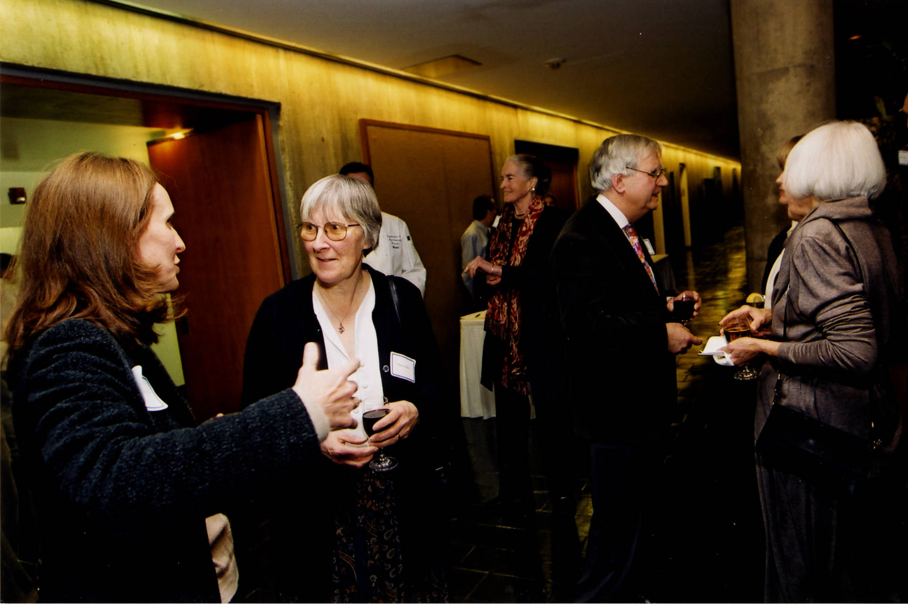 Attending the spring term reception to welcome newly arriving Members and Visitors in Marilyn and James Simons Hall on the Institute campus are (l. to r.): an unidentified guest, Helen Goddard, Peter Goddard, and Gerda Panofsky. Patricia K. Woolf is the middle background speaking with IAS Chef Michel Reymond who is only partially visible.