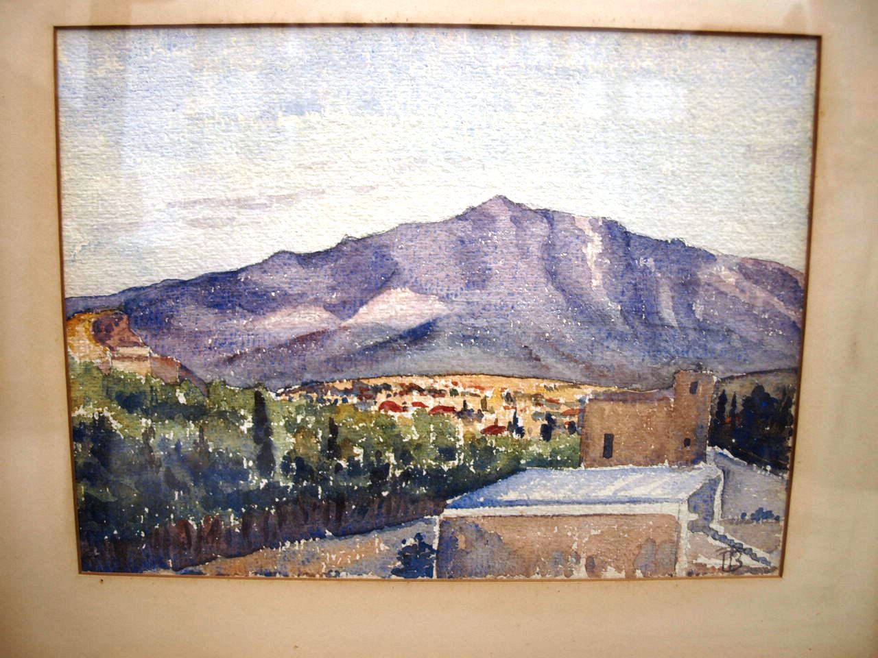 Framed watercolor showing a mountain landscape with minor discoloration