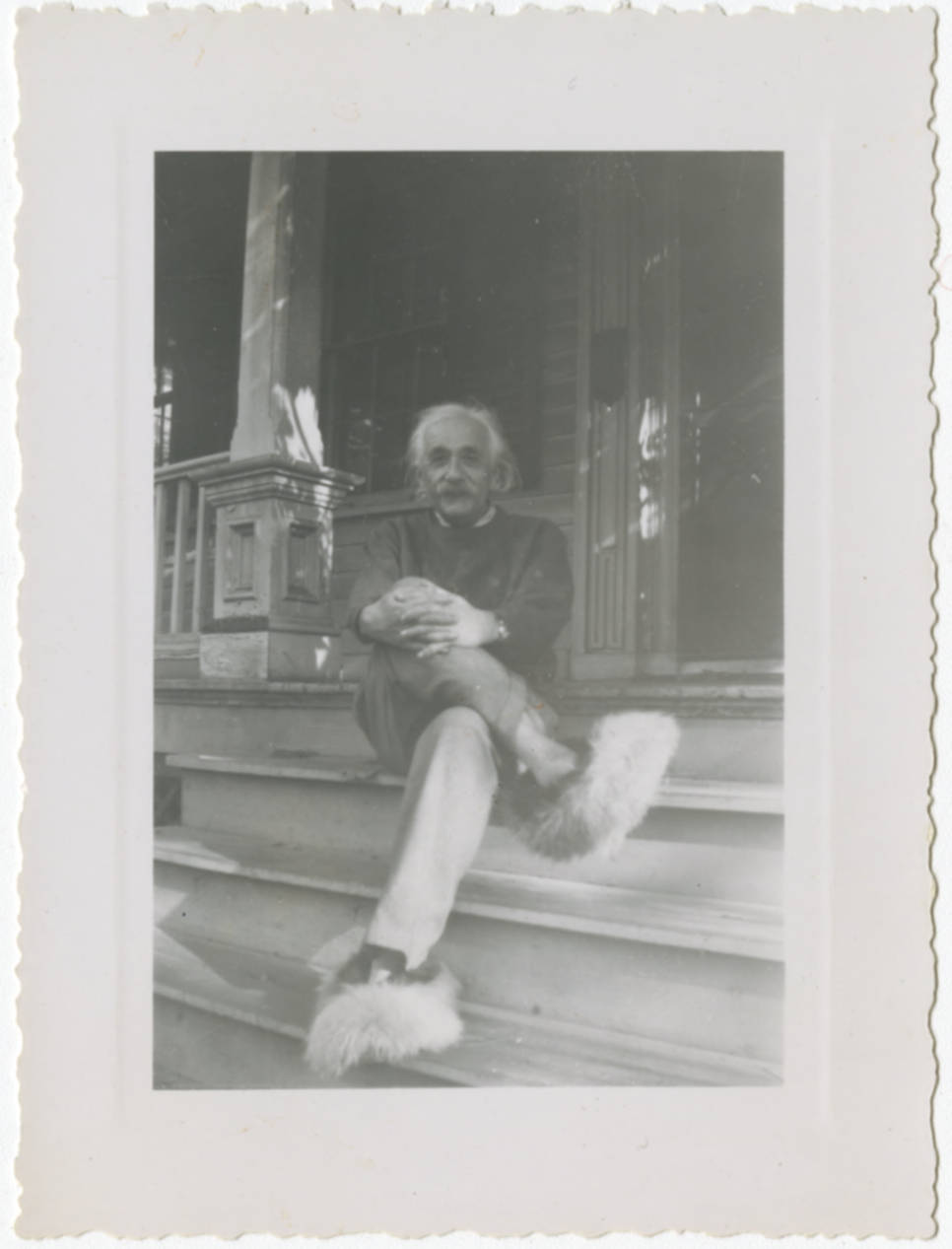 Albert Einstein wearing fuzzy slippers sitting on the front steps of his home at 112 Mercer Street in Princeton, New Jersey.