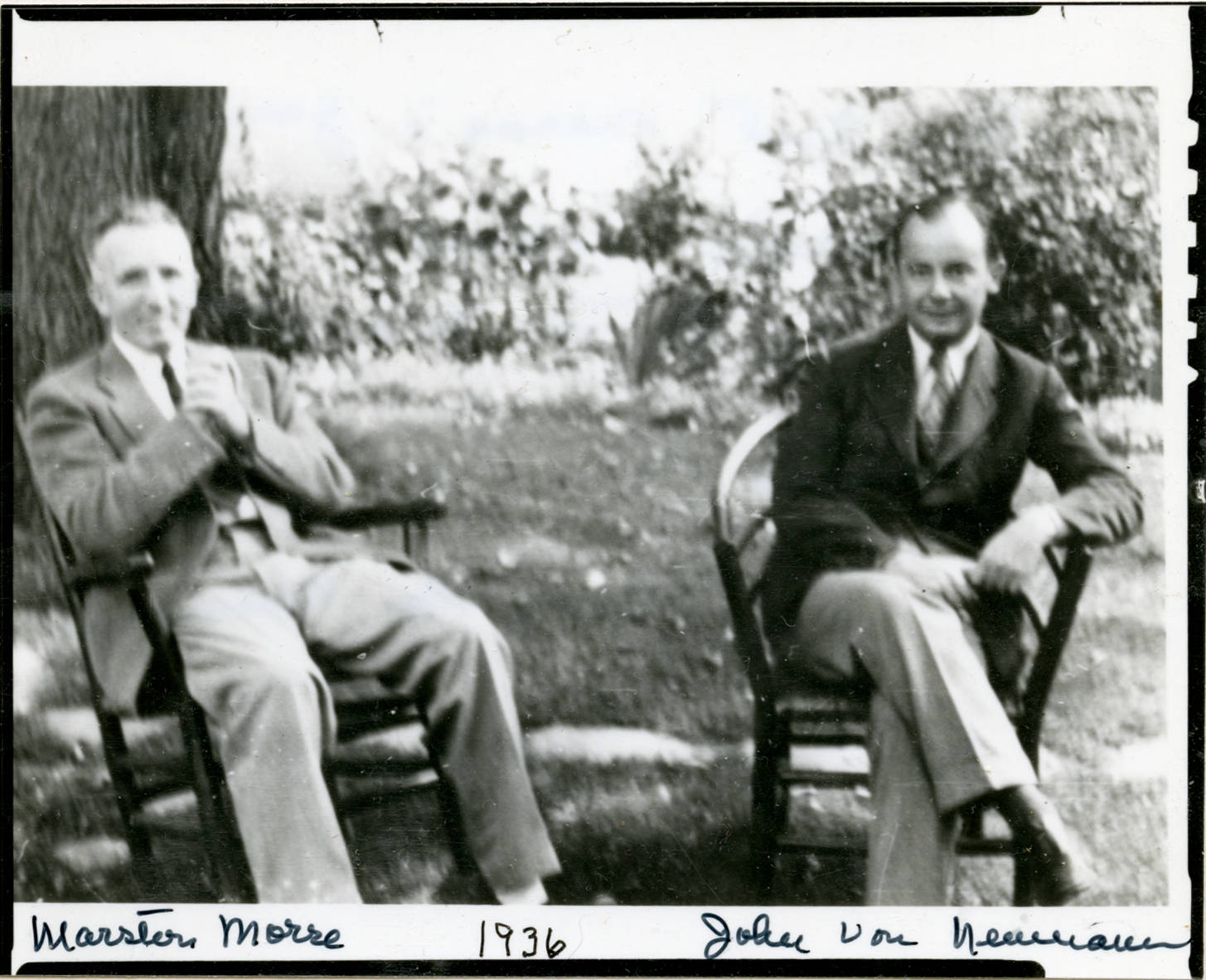 Marston Morse (l.) and John von Neumann seated in the garden of Morse's Waterville, Maine, house.