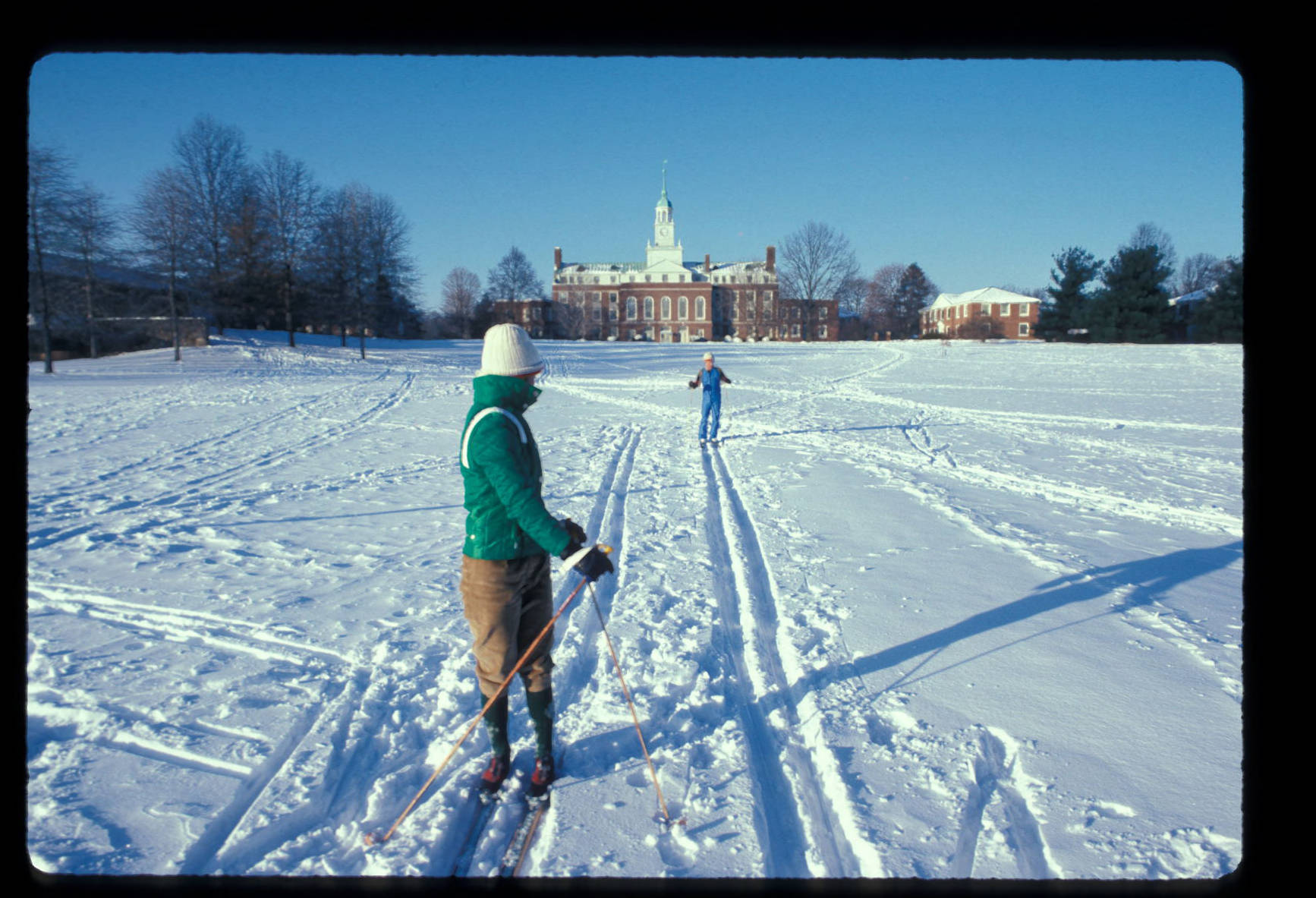 Institute - view from woods, cross-country skiers