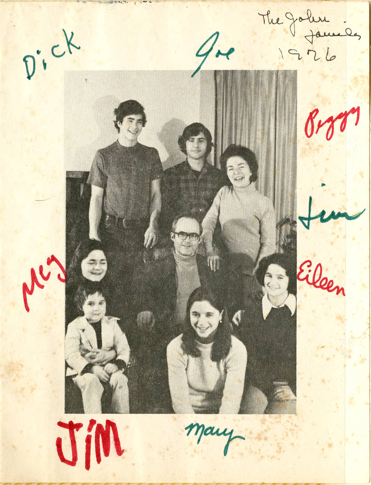 Front panel of a holiday card from the Peggy and James Joseph John Family to the Morses. Members of the John Family have signed their first name. The interior of the card features a printed holiday greeting as well as a handwritten note.