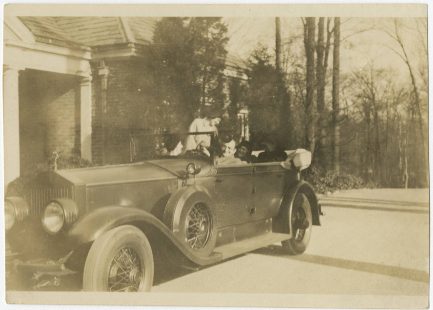 At the New York (Huntington, Long Island) estate of Wilton Lloyd-Smith, Albert Einstein in the back seat of a car with his wife, Elsa, next to him. The other individuals have not been identified.
