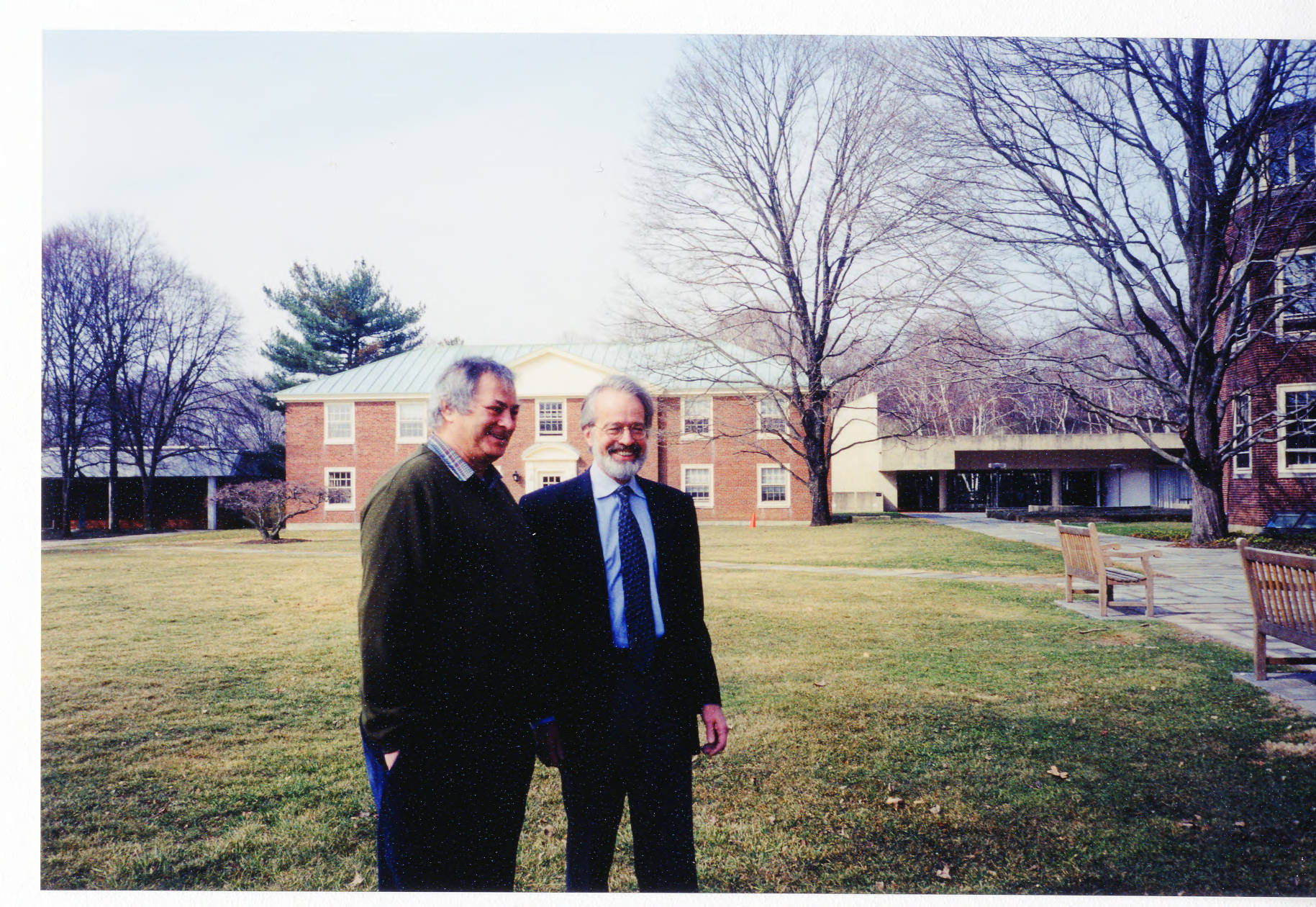 AMIAS (Association of Members of the Institute for Advanced Study) sponsored four public lectures on April 4 & 5, 2003, that were presented at the Institute. Arnold Levine (l.), visiting professor and Member of the School of Natural Sciences, and School of Historical Studies Faculty member Heinrich von Staden are two of the presenters, and are seen here standing on the green at the center of the academic buildings on the Institute campus. Levine was later appointed to the Faculty and established what was named in 2005 The Simons Center for Systems Biology.