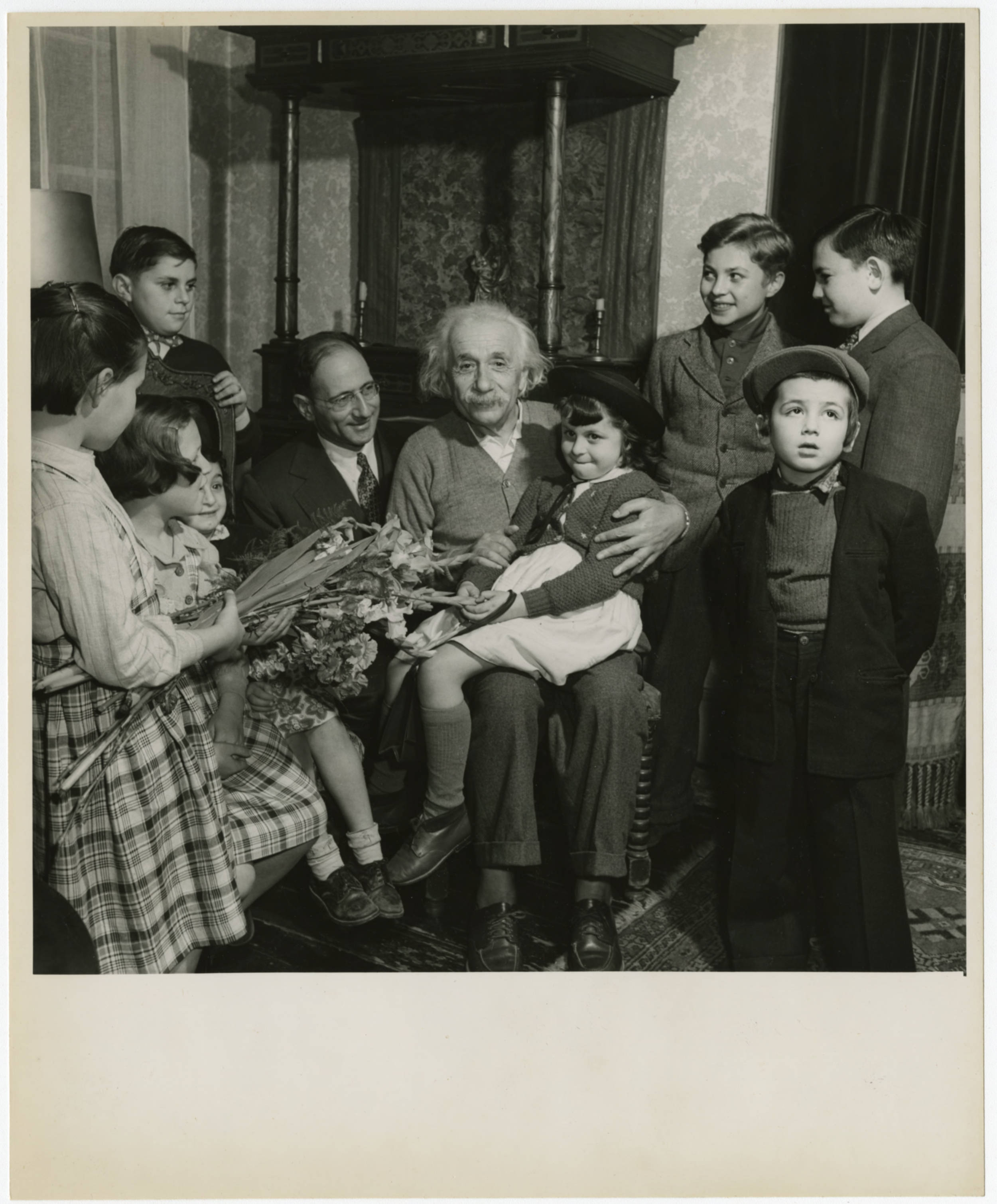 At his home (112 Mercer Street) in Princeton, New Jersey, one day before his seventieth birthday, Albert Einstein is visited by a group of World War II European Jewish refugee children. On Einstein's right is the National Chairman of the United Jewish Appeal, William Rosenwald. United Service for New Americans, an agency of the UJA, brought the children to the United States. Einstein's distant cousin, Elizabeth Kerzek (second from left), is among the group. The cousins had not met before. The name of the girl seated on Einstein's lap is Victoria Lustig. Most of the others featured in this photograph have not been identified. Newspaper accounts of the occasion feature different images from the visit and credit the photographs to various sources, most often news agencies. (Note: this photograph is one of fifteen in the collection, EB 127-EB 141, taken on this occasion.)