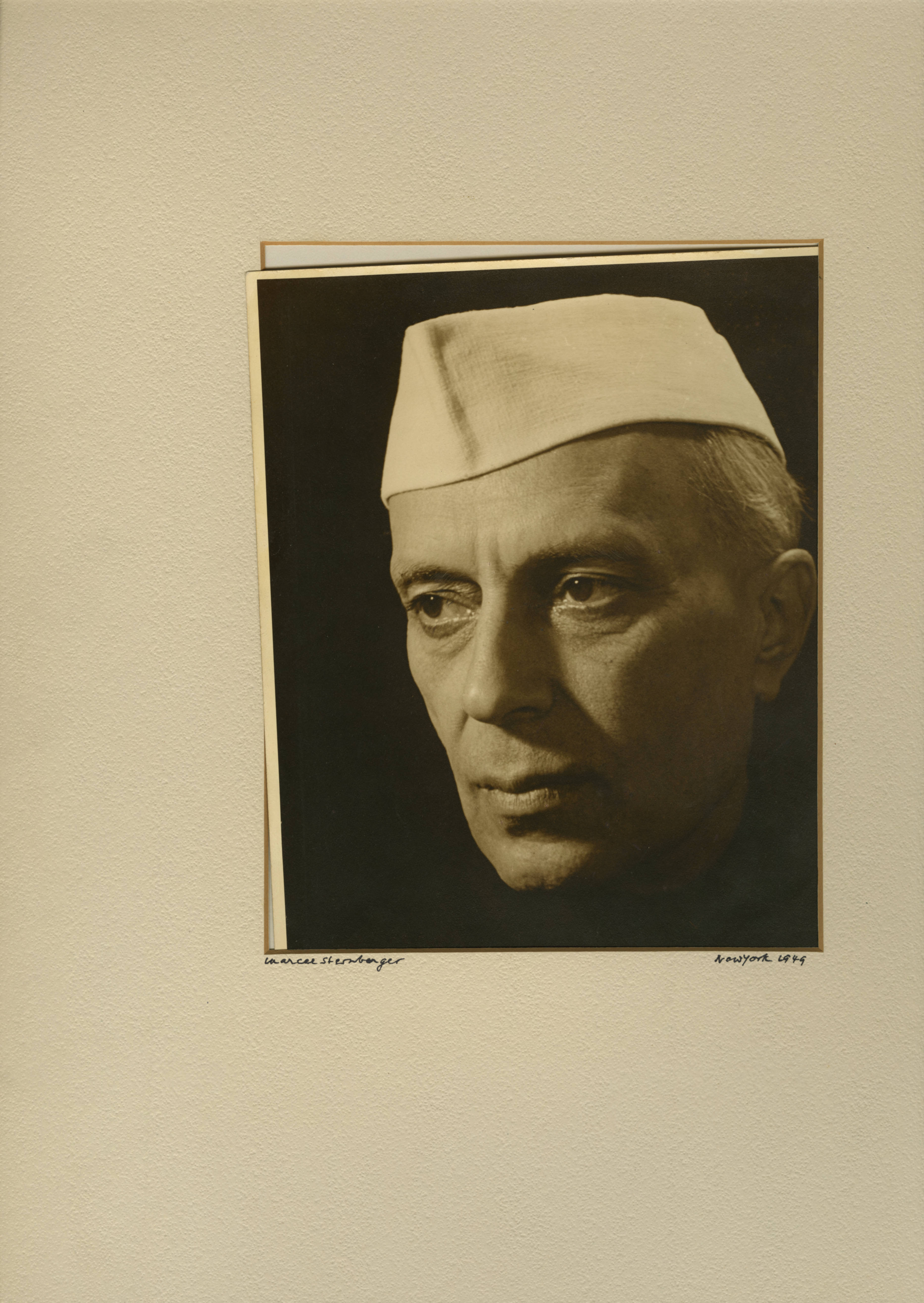 This formal portrait of Indian statesman Jawaharlal Nehru was taped between two mat boards. The front board is signed by the photographer in ink in the lower left, and the date and location (New York) are in the lower right. (Also, see Einstein portraits EB 197 and EB 198, which were taken by the same photographer.)