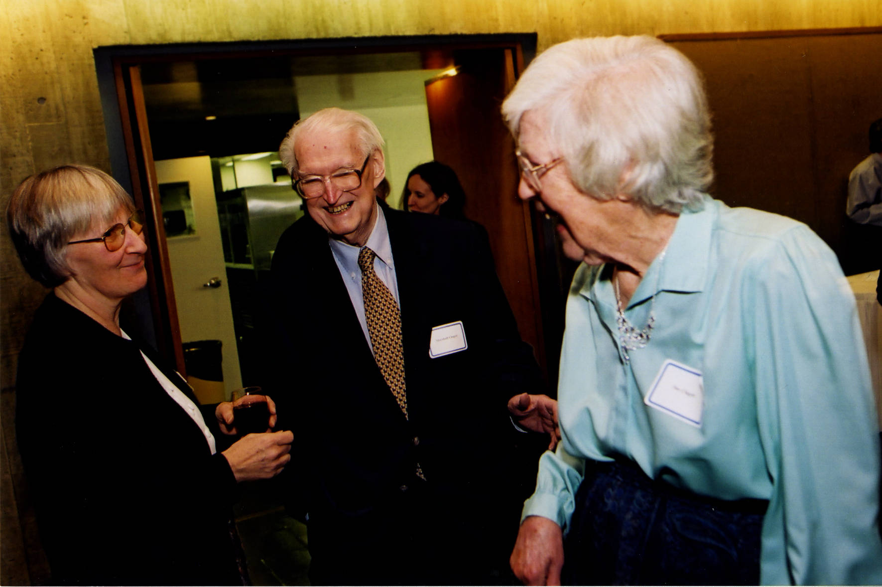 Attending the spring term reception to welcome newly arriving Members and Visitors in Marilyn and James Simons Hall on the Institute campus are Helen Goddard (l.) with School of Historical Studies Faculty Emeritus Marshall Clagett and his wife, Susan.