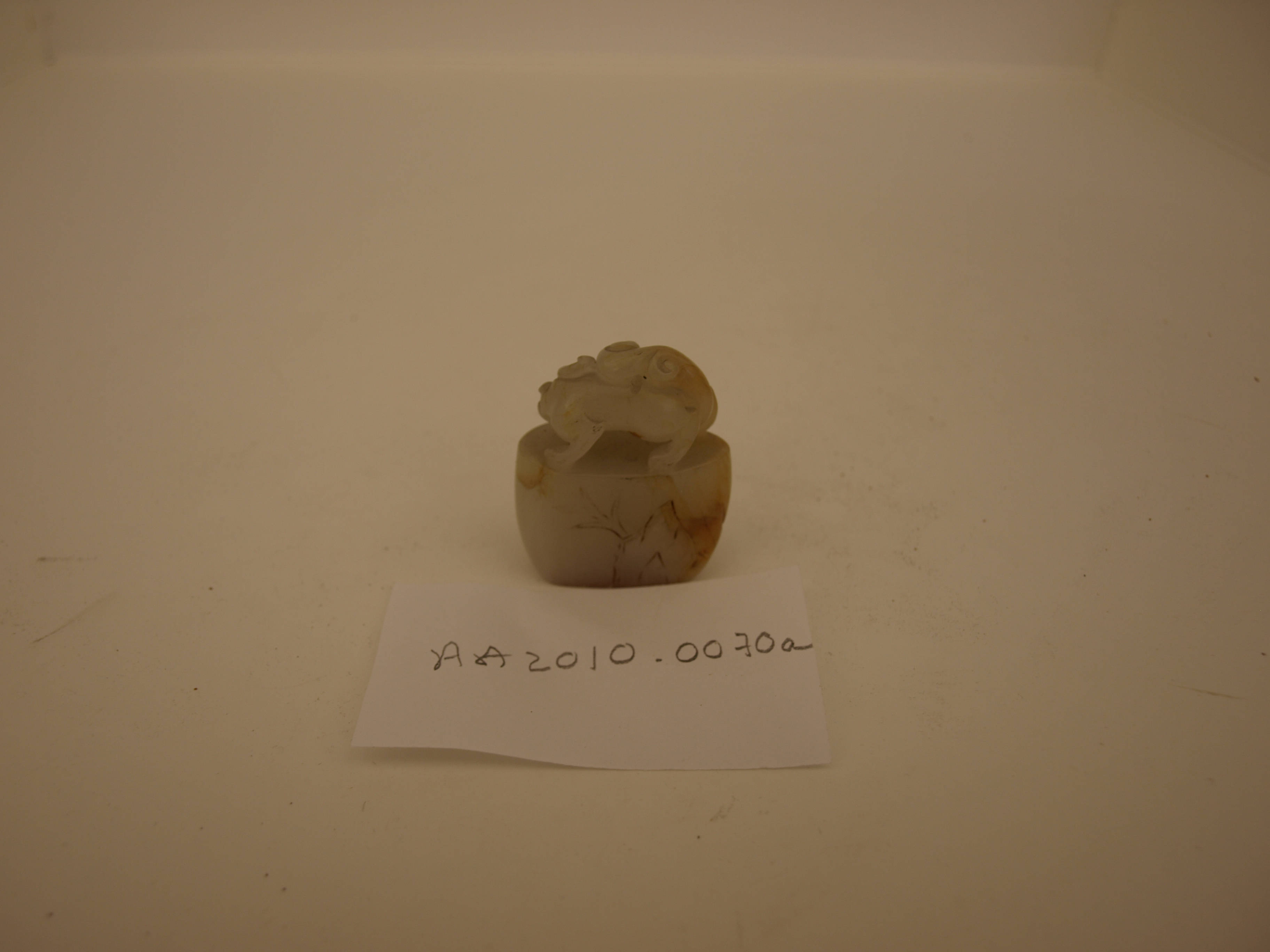 Chinese chop probably carved from either jade or agate. The piece is topped by the figure of a dragon or lion, and the side is incised with the representation of a tree and a mountain. The bottom of the piece shows evidence of red ink.