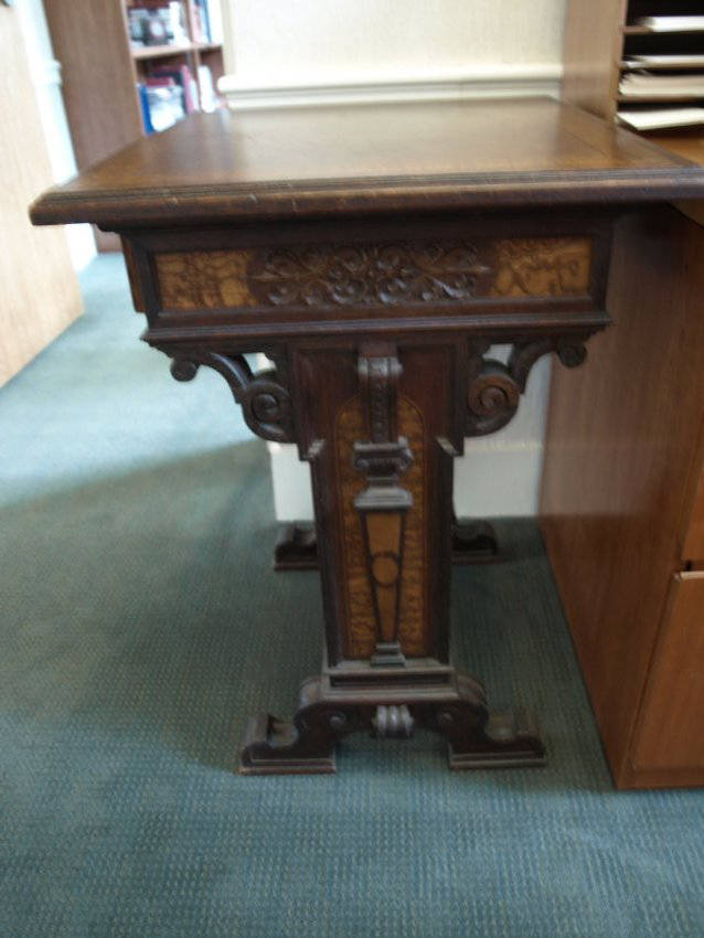 Table from Einstein's house. It has carved legs, inlay top, and one drawer.