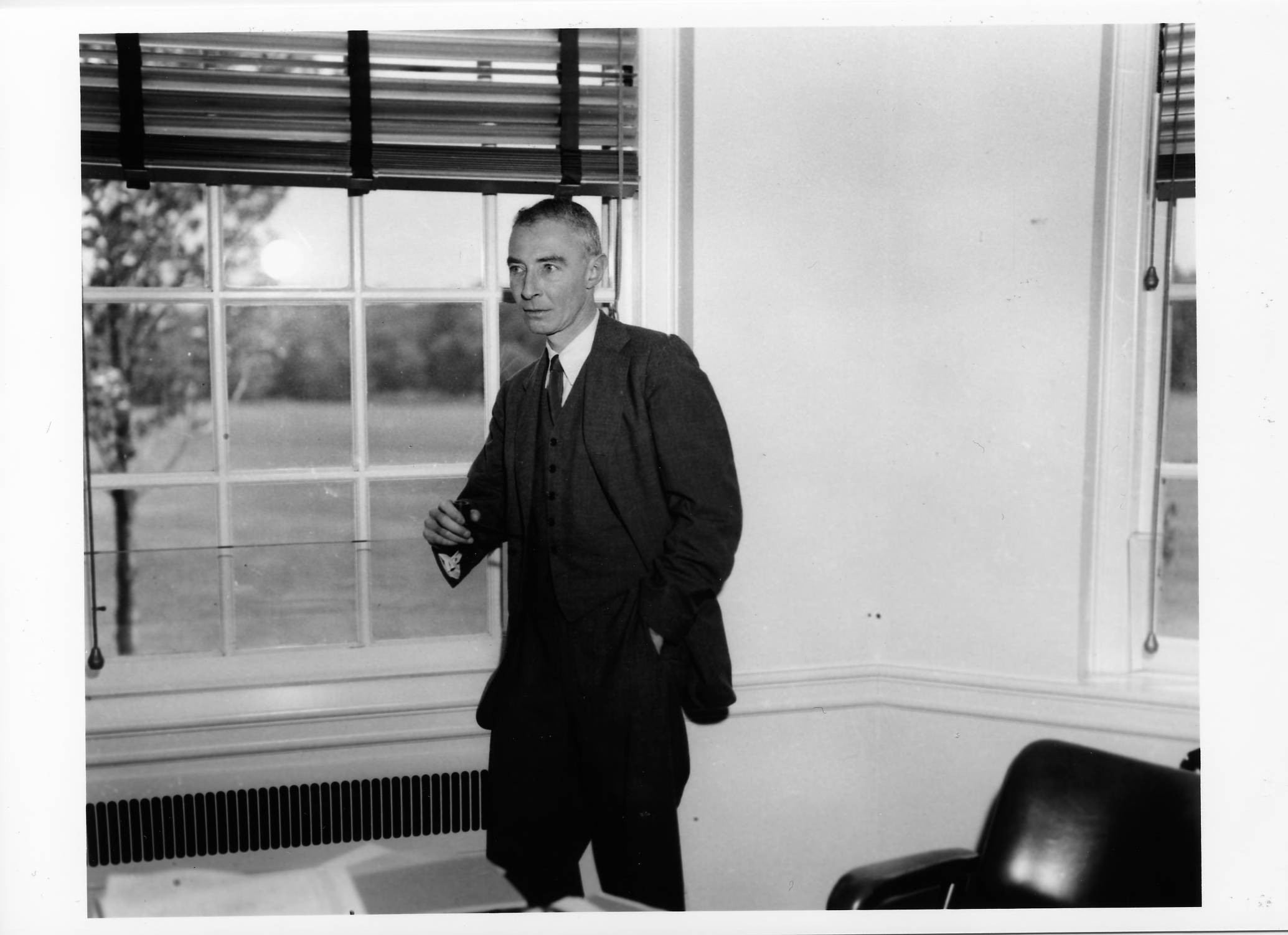 4. J. Robert Oppenheimer standing in office, hand in pocket.