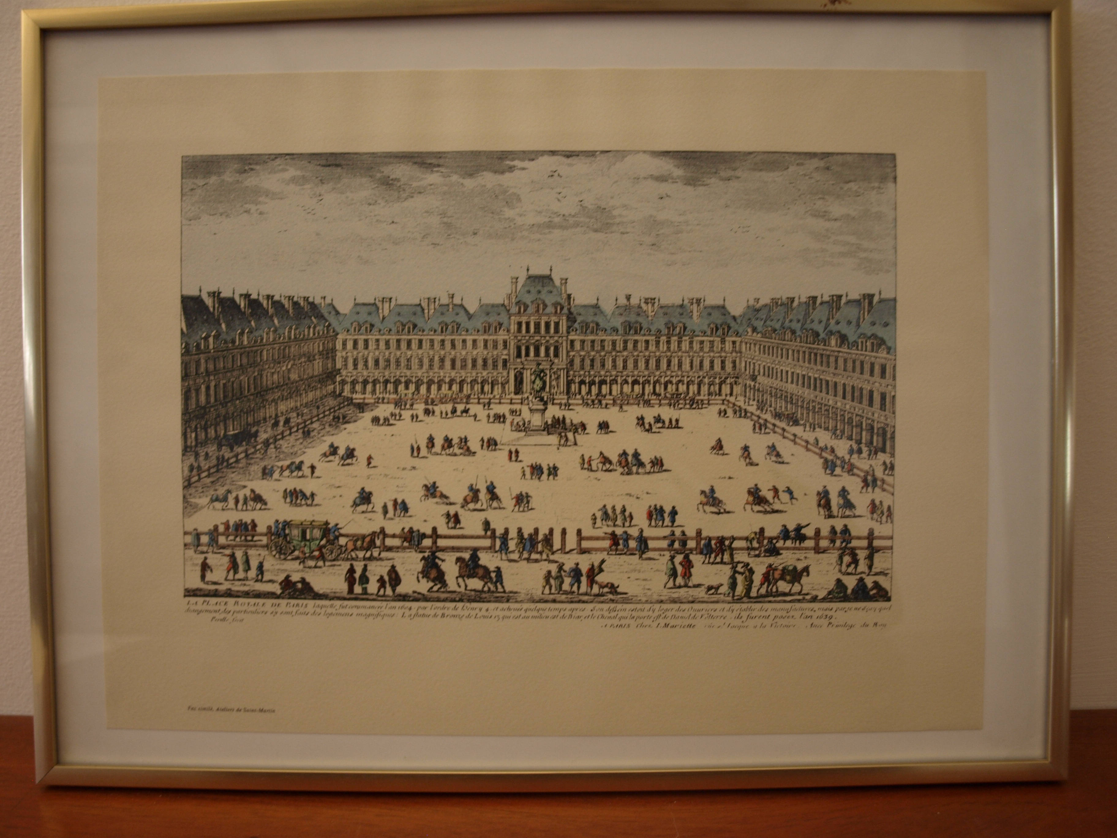 Etching of the Place Royale de Paris with a wooden fence surrounding the Place, many people, horses, carriages; a bronze statue in the center is of Louis XIII on a horse.; sections are lightly hand colored; "La Place Royal de Paris laquelle fut commancee l'an 1604 par l'ordre de Henri 4.. ils poser l'an 1639: lower right is written: A Paris Chez I. Mariette.; a later version of the same view is by Rigaud (AA2010.0097.9).