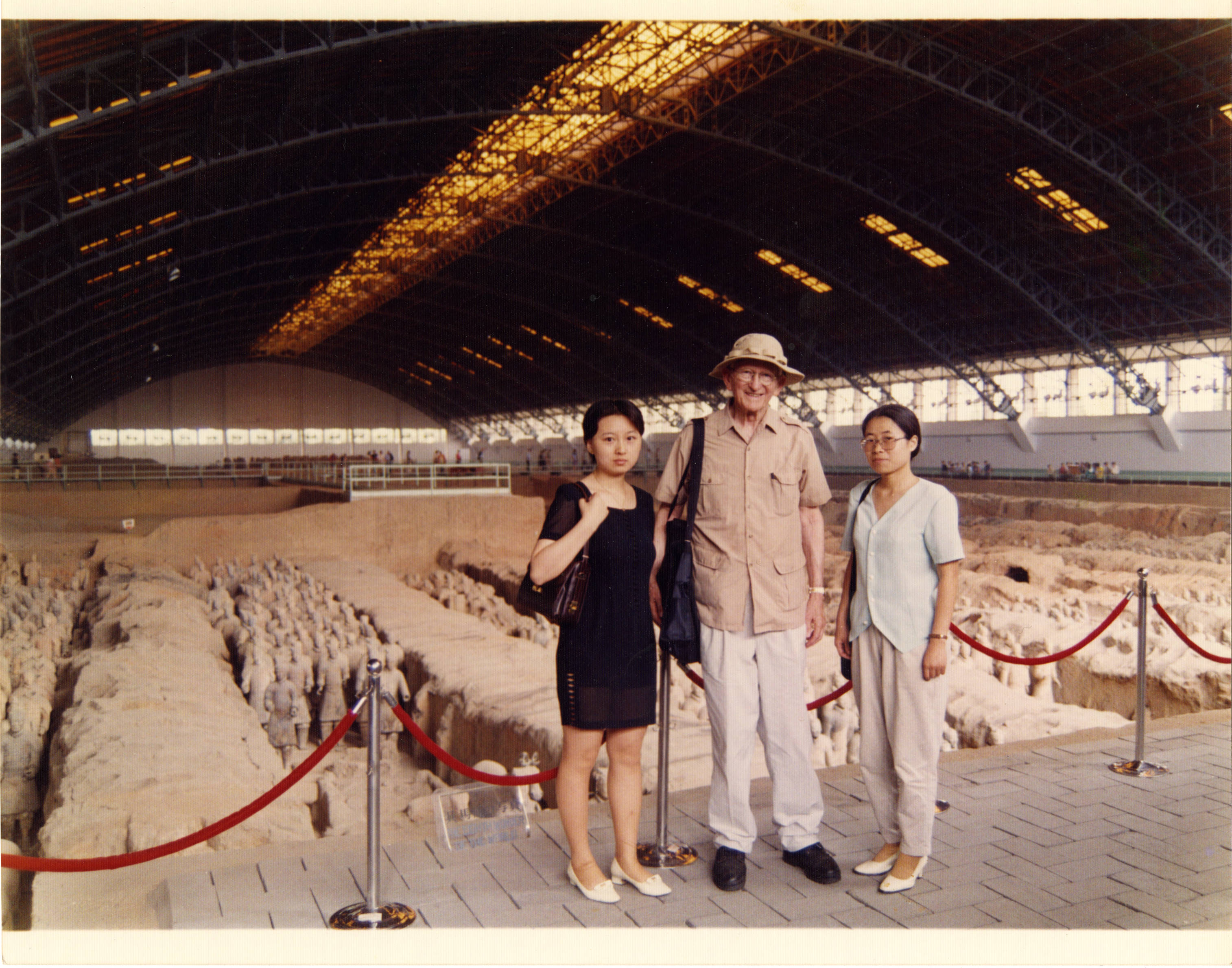 Atle Selberg standing with two unidentified women next to the Terracotta Army in Xian, China