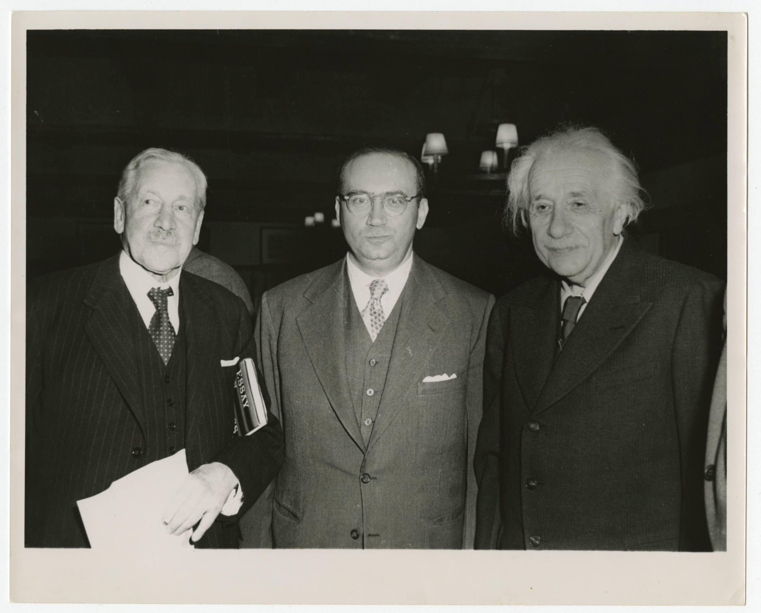 At what appears to be an event held in conjunction with the publication of Herbert Louis Samuel's book, Essay in Physics, Samuel (left) is shown with Albert Einstein (right) and an unidentified man. The location has not been identified. (Also, see EB 119, EB 120, and EB 122.)