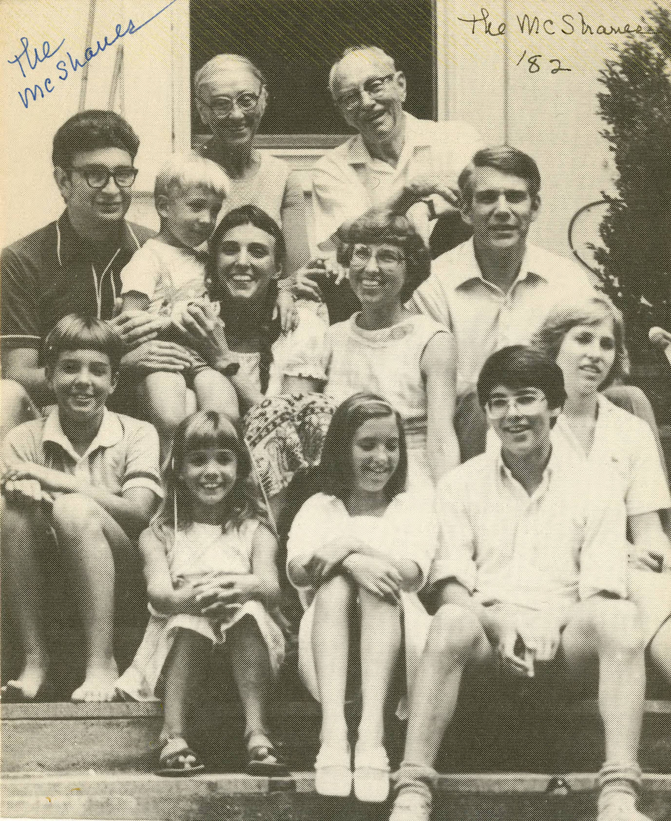Portrait of the McShane Family (Edward James and Virginia Haun) on the back of a greeting card with text on the interior and artwork by a family member on the front.