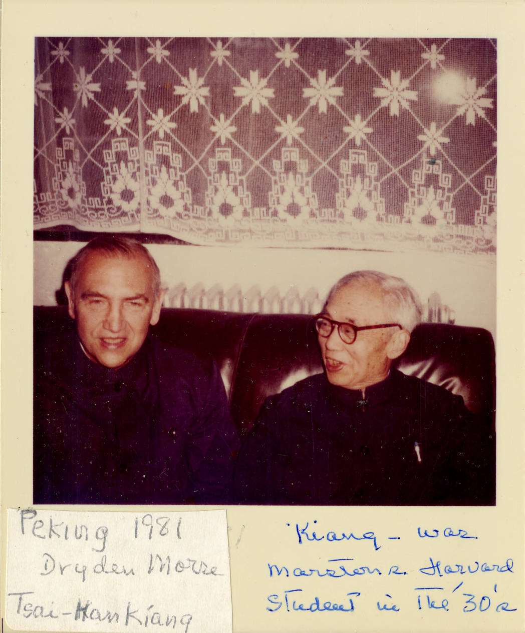 In Peking, Marston Morse's son from his first marriage, Dr. Dryden Morse, sits with one of Marston Morse's Harvard University students, Tsai-han Kiang, who studied with Marston in the 1930s.