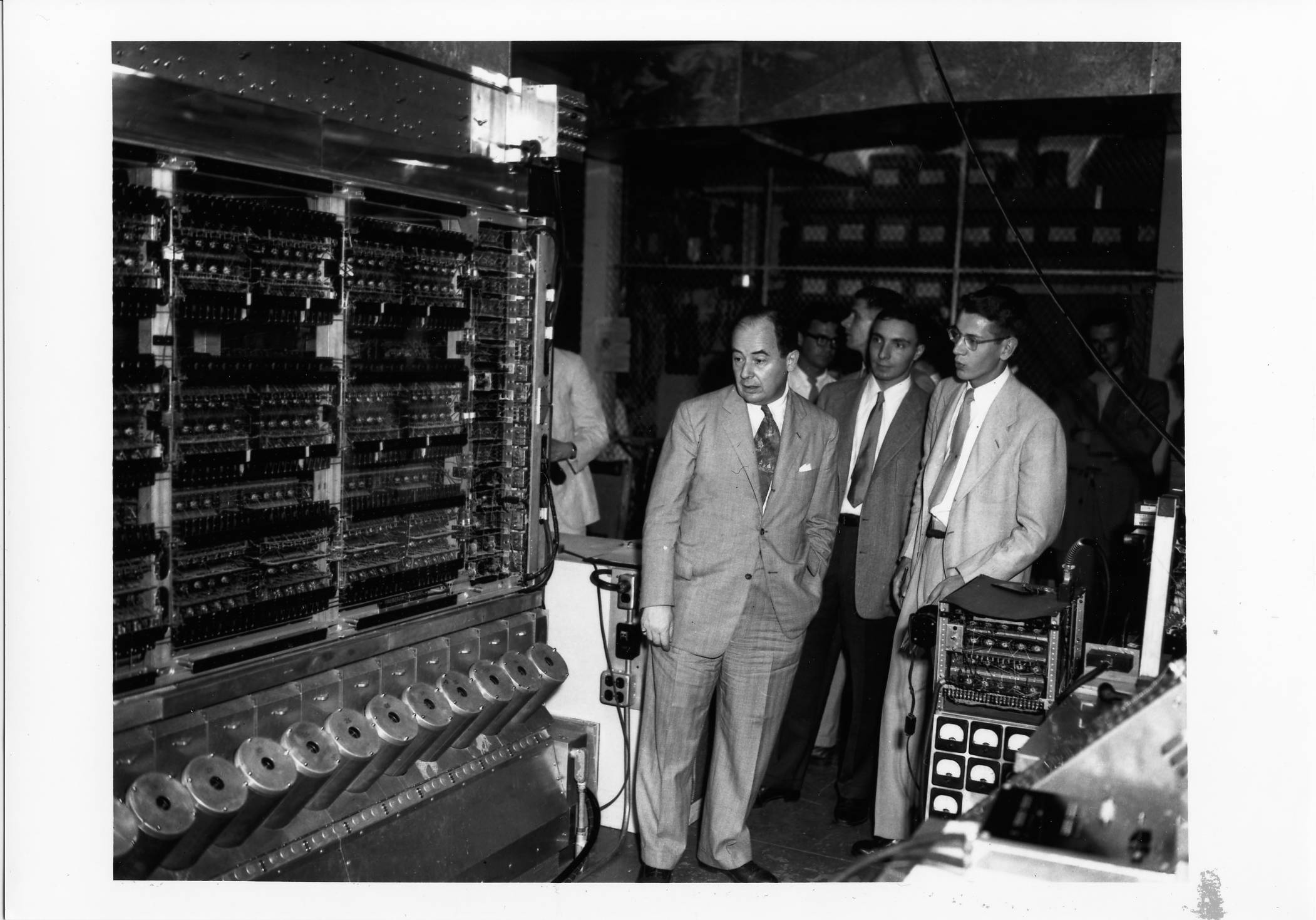 John von Neumann and guests examine the Electronic Computer Project computer.