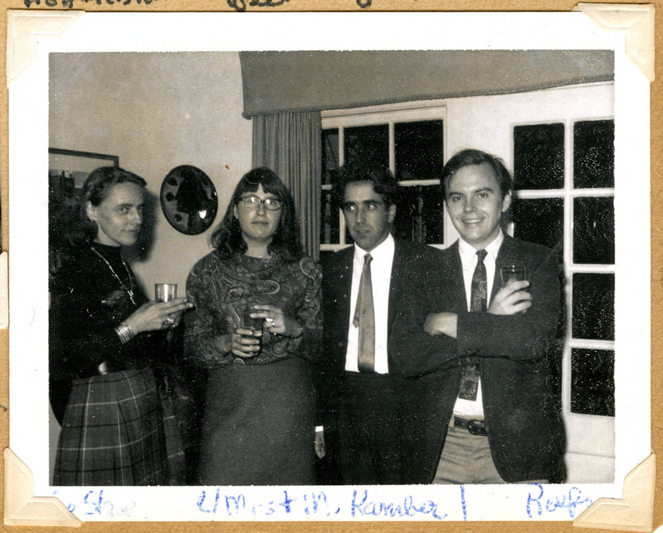 Attending a social gathering of the School of Mathematics at the home of Louise and Marston Morse, are (l. to r.): Miss Shepherd (according to Louise Morse), Mrs. and Professor Franz W. Kamber, and Dale Preston Rolfsen.