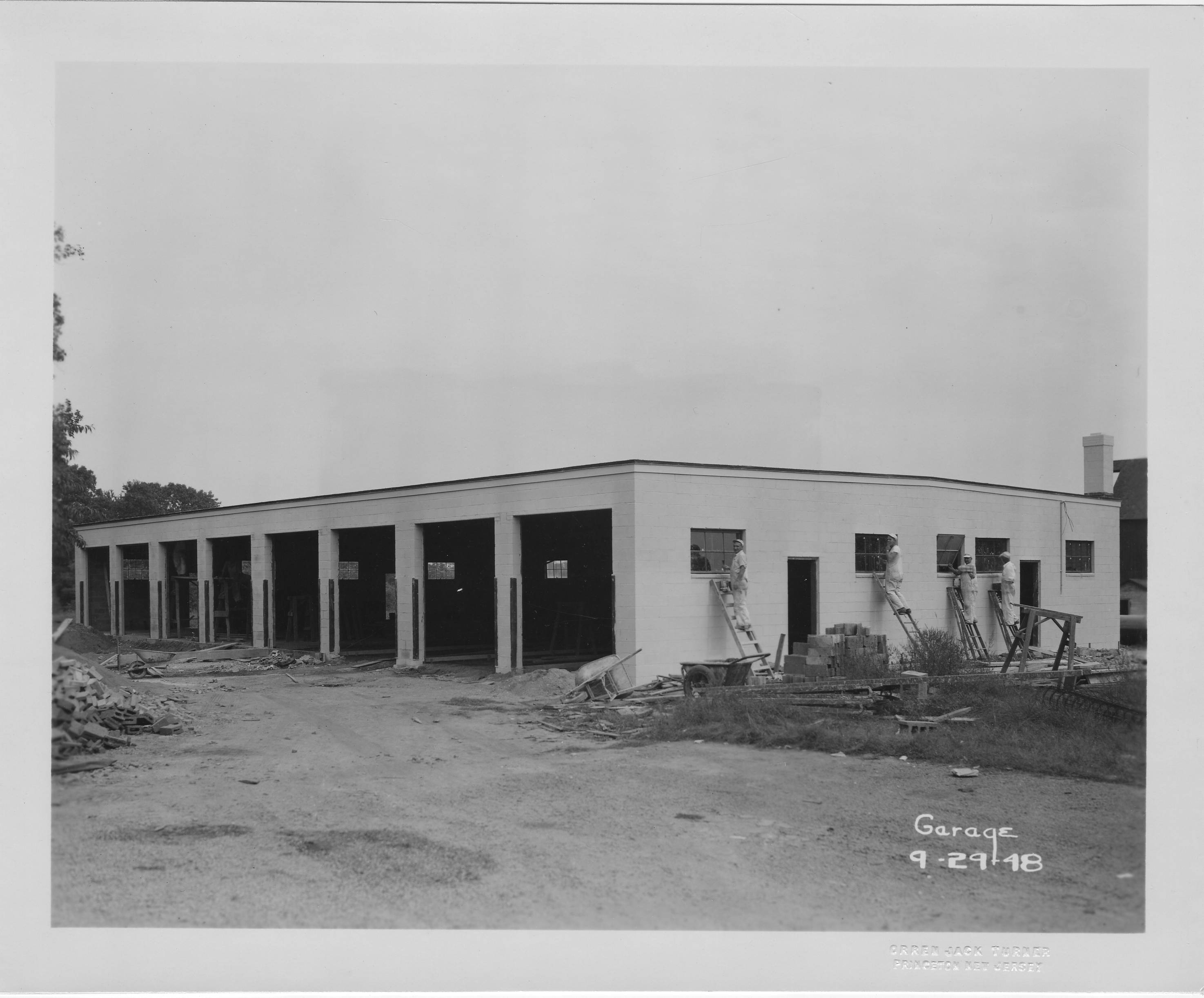 Construction of the garage and shop building on the Institute campus taken from the northeast and looking southwest. George A. Fuller Co. was engaged to do this construction.