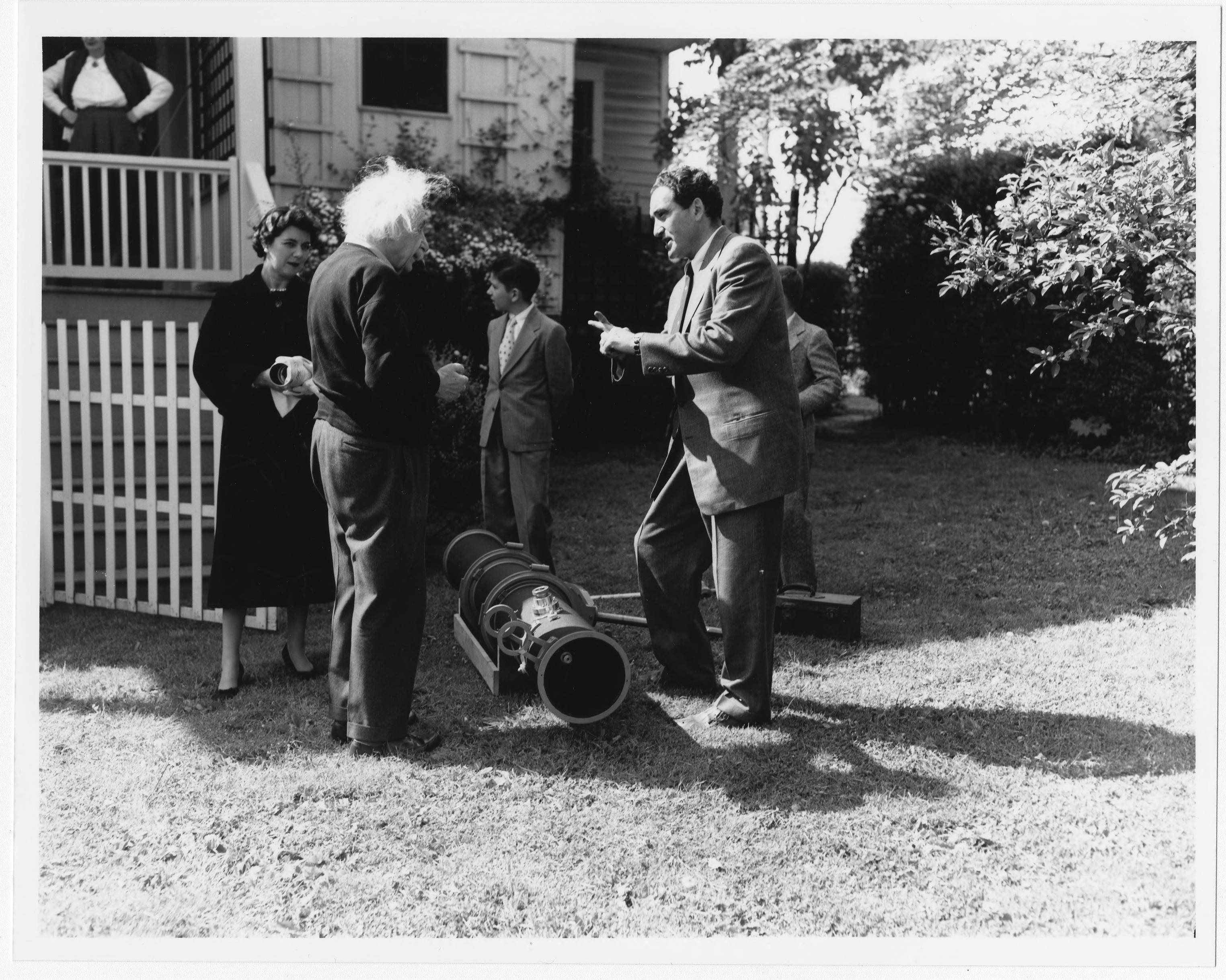 Pictured with a telescope are Albert Einstein, Zvi Gezari, and an unidentified woman and two boys in the backyard of Einstein's home at 112 Mercer Street, Princeton, New Jersey.