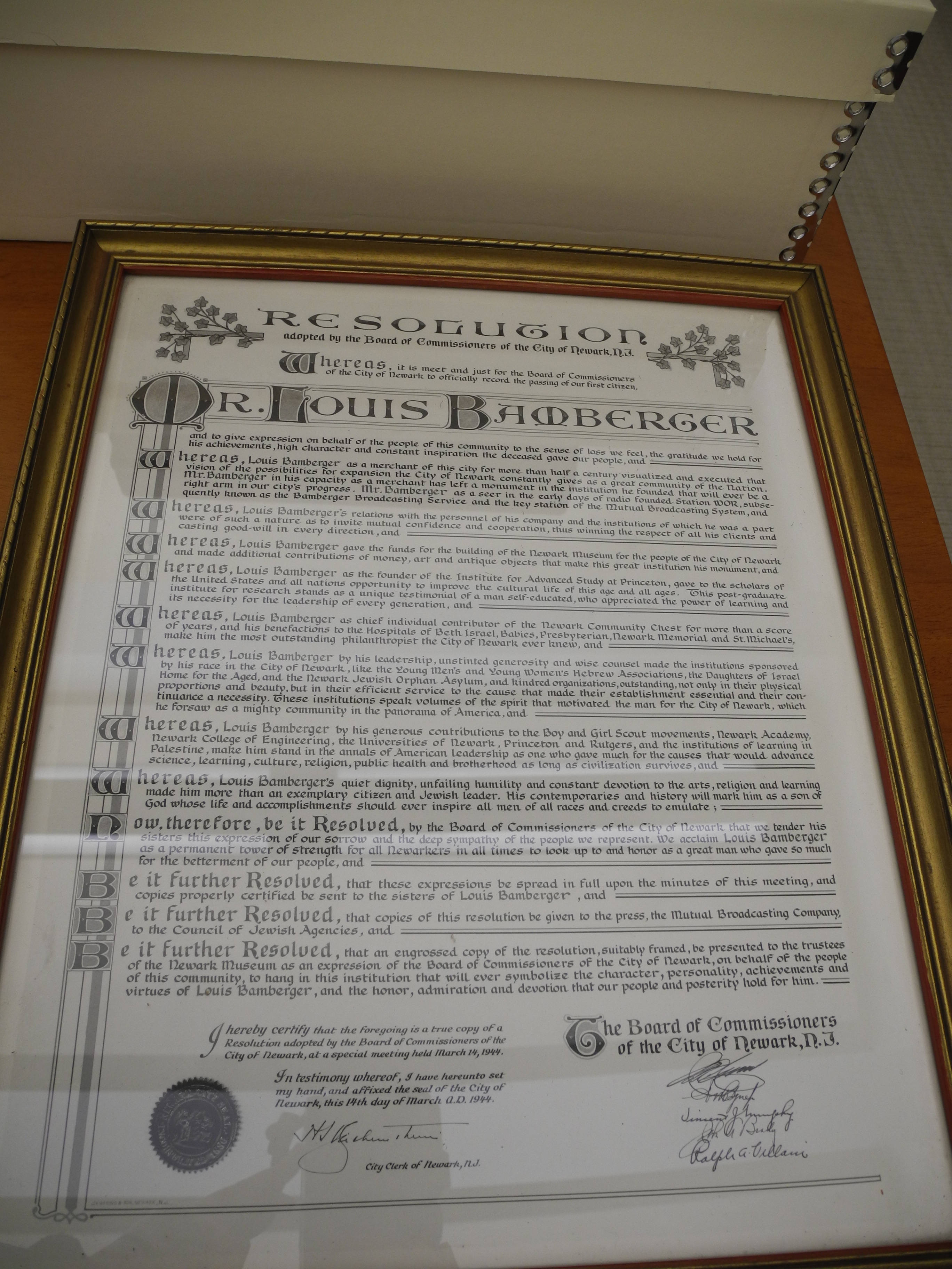 Broadside in calligraphic typeface that is a memorial resolution issued by the Board of Commissioners of the City of Newark on the death of Louis Bamberger. The text of the resolution highlights Bamberger's life accomplishments (including the founding of the Institute), and has some decorative elements along the top. The signature of the city clerk of Newark, New Jersey, and the signatures of the Board of Commissioners are at the bottom. In a gold frame.