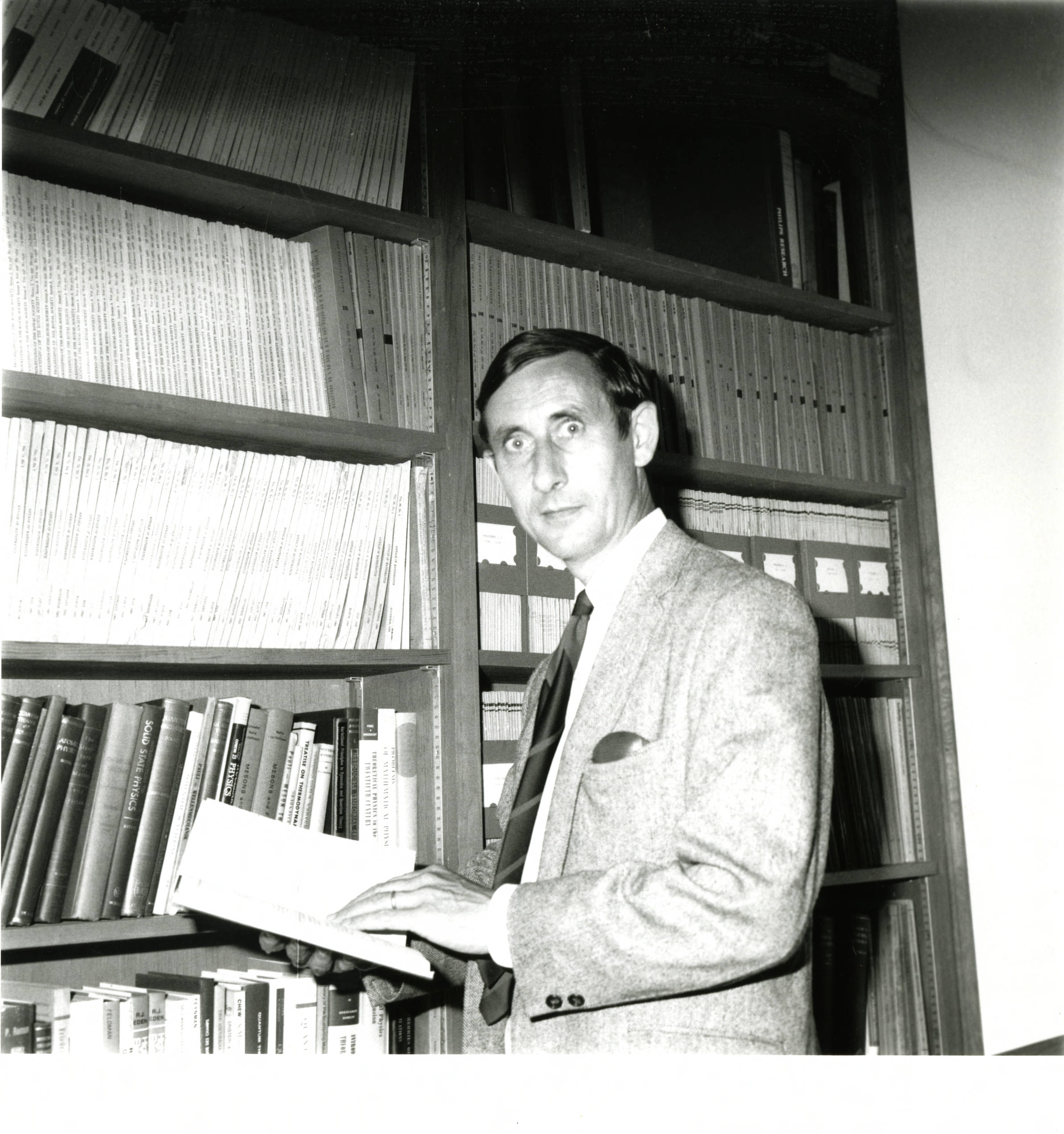 School of Natural Sciences Faculty member Freeman Dyson at bookcase.