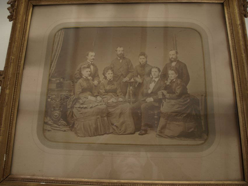 Sepia photograph of four men and four women in a formal studio pose; printed at the bottom of the mat is ""Phor. v. J. Bleibel in Stuttgart" plaster gilt frame; on the paper backing (torn) is a white label with the number #52 written on it; glass is wavy and probably hand blown.