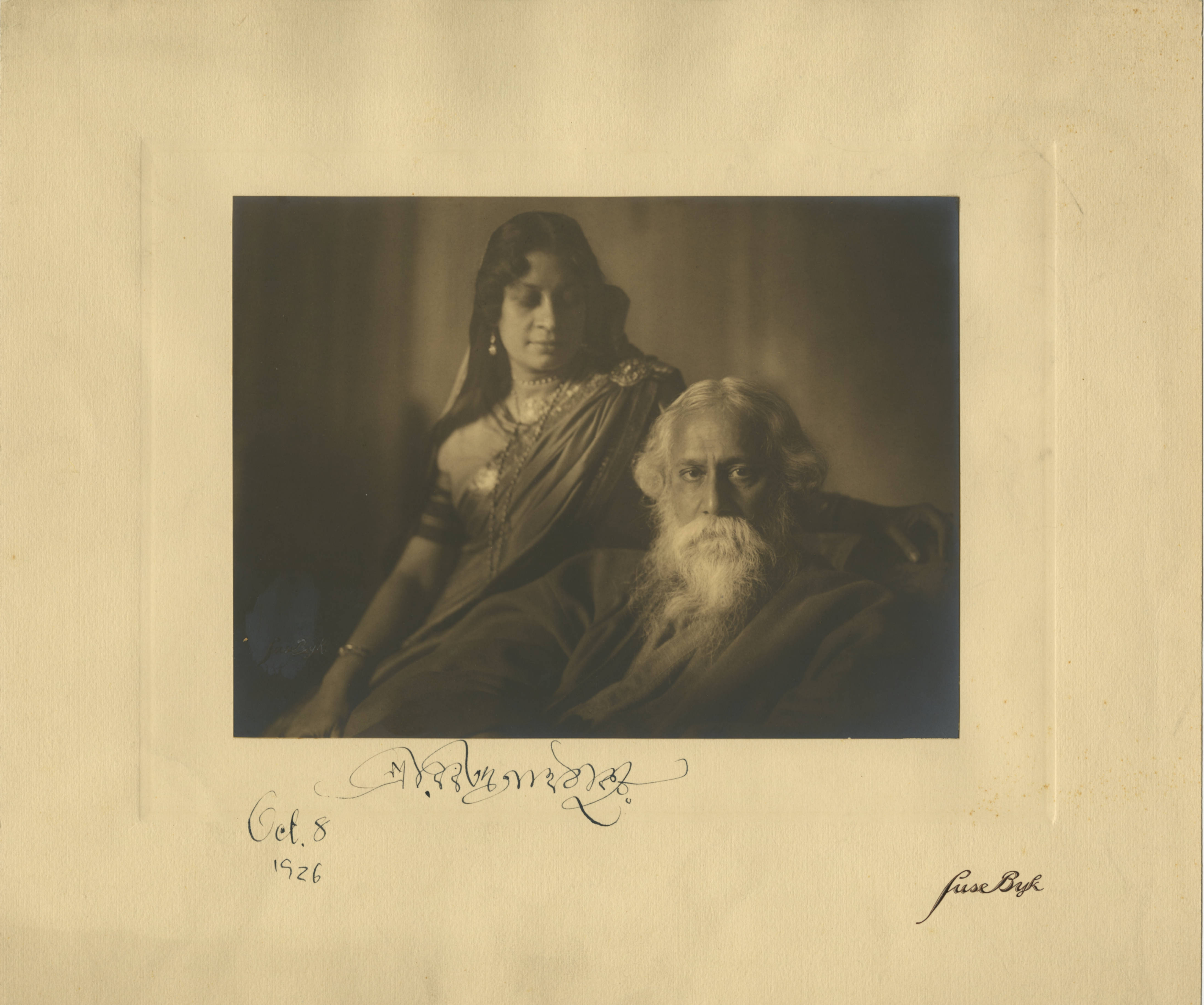 This formal portrait of Rabindranath Tagore and an unidentified woman was taken at an unidentified location. The print is adhered to heavyweight paper that is imprinted with the photographer's name in the lower right corner. The photograph itself is also signed in ink by the photographer, and the date and signature (in Bengali) on the lower left on the mat board would appear to have been inscribed by Tagore himself. Also, see EB 227 and EB 228, which are by the same photographer and taken on the same occasion.