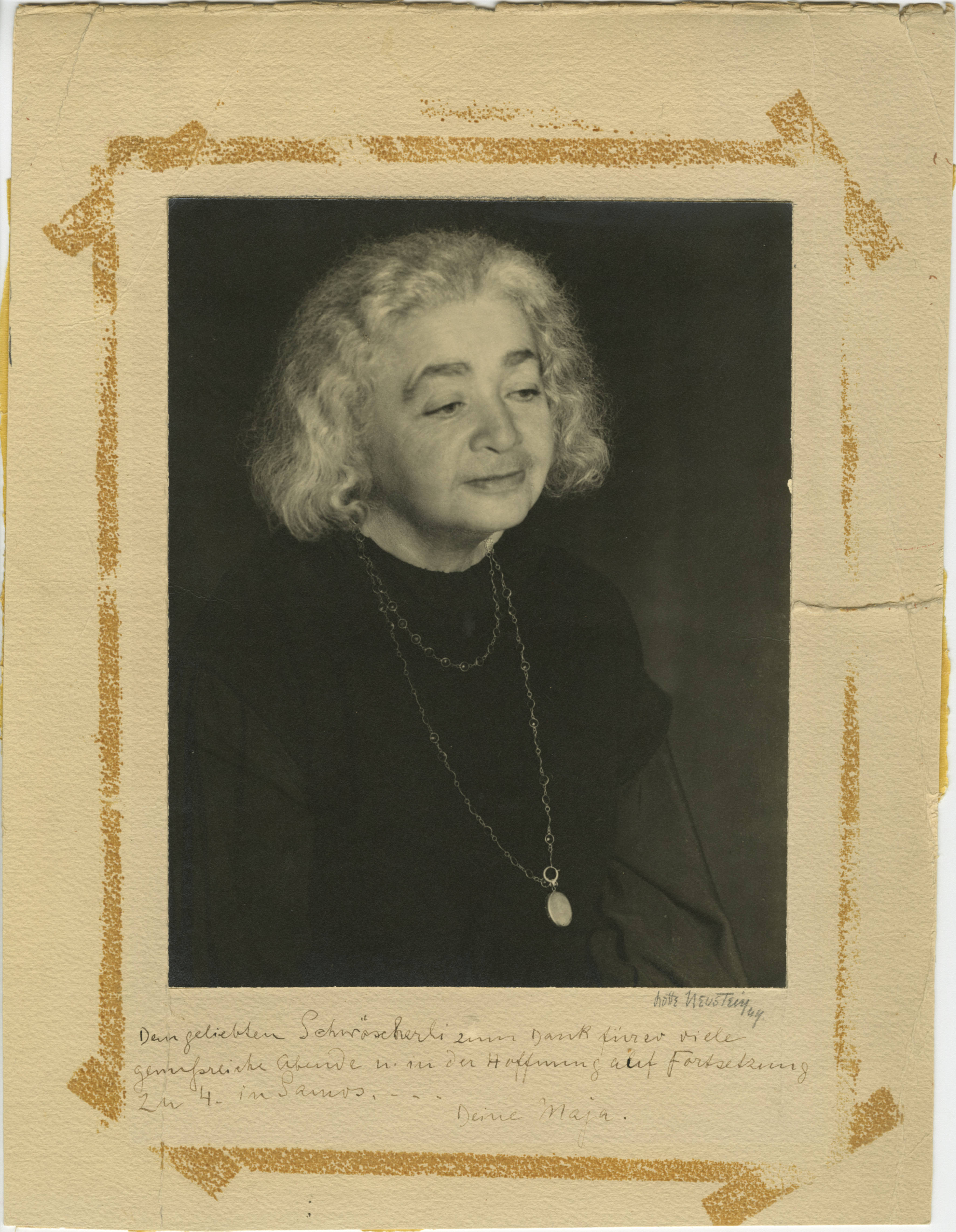 A formal portrait of Albert Einstein's sister, Maja. This print is adhered to heavyweight paper and is signed in pencil on the lower right below the print by the photographer, who was located in New York. There is also an ink inscription from Maja to a recipient, but the text isn't entirely legible. The collection copy of the print is undated