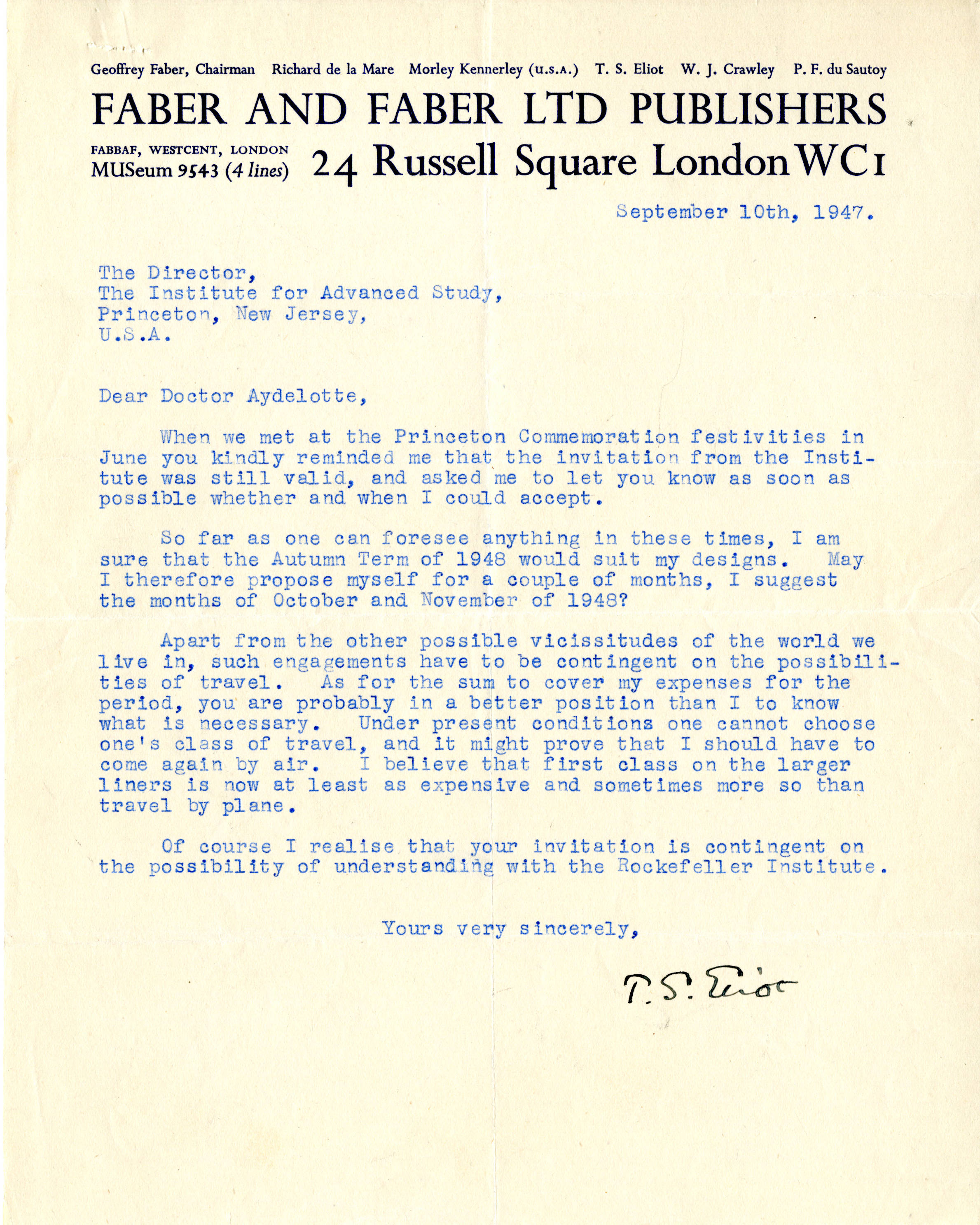 After several unsuccessful attempts, Institute Director Frank Aydelotte successfully convinced writer T.S. Eliot to make a visit to the Institute. In this letter, Eliot proposes a timetable, for the fall of 1948. Eliot left slightly earlier than he had planned after winning the Nobel Prize for Literature in 1948.