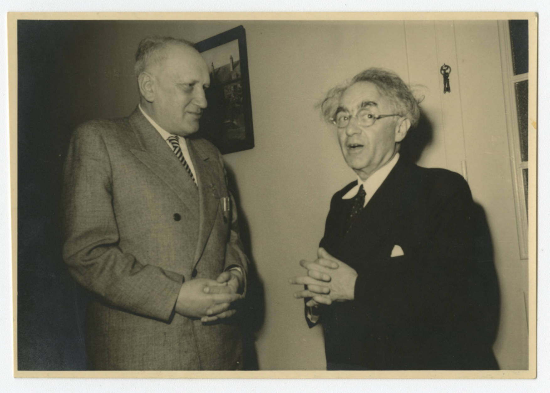 Taken in Bern, Switzerland, photograph of physicist Leopold Infeld (left) and economist Otto Nathan. Nathan was designated by Albert Einstein as the executor of his estate and co-trustee (with Helen Dukas) of his literary property. The image is in postcard format and stamped on the back: "Alfred Rohrer, Photograph, Bern...Reproduktion Verboten." It's likely that this photograph was taken in conjunction with the conference entitled the "Jubilee of Relativity Theory" that was held in Bern in 1955.