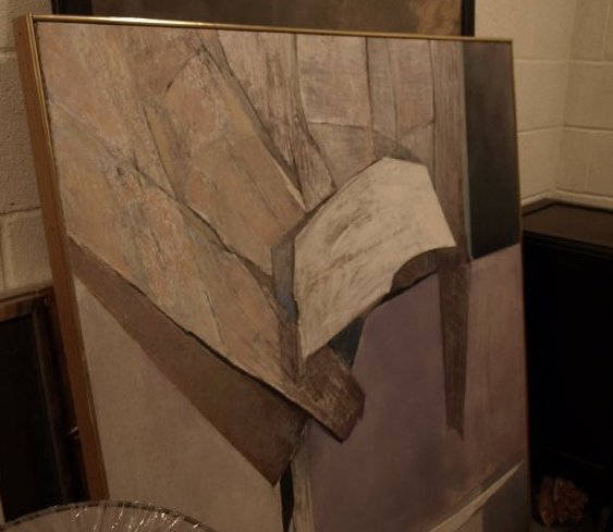 Large abstract oil painting in purples, grays and black.