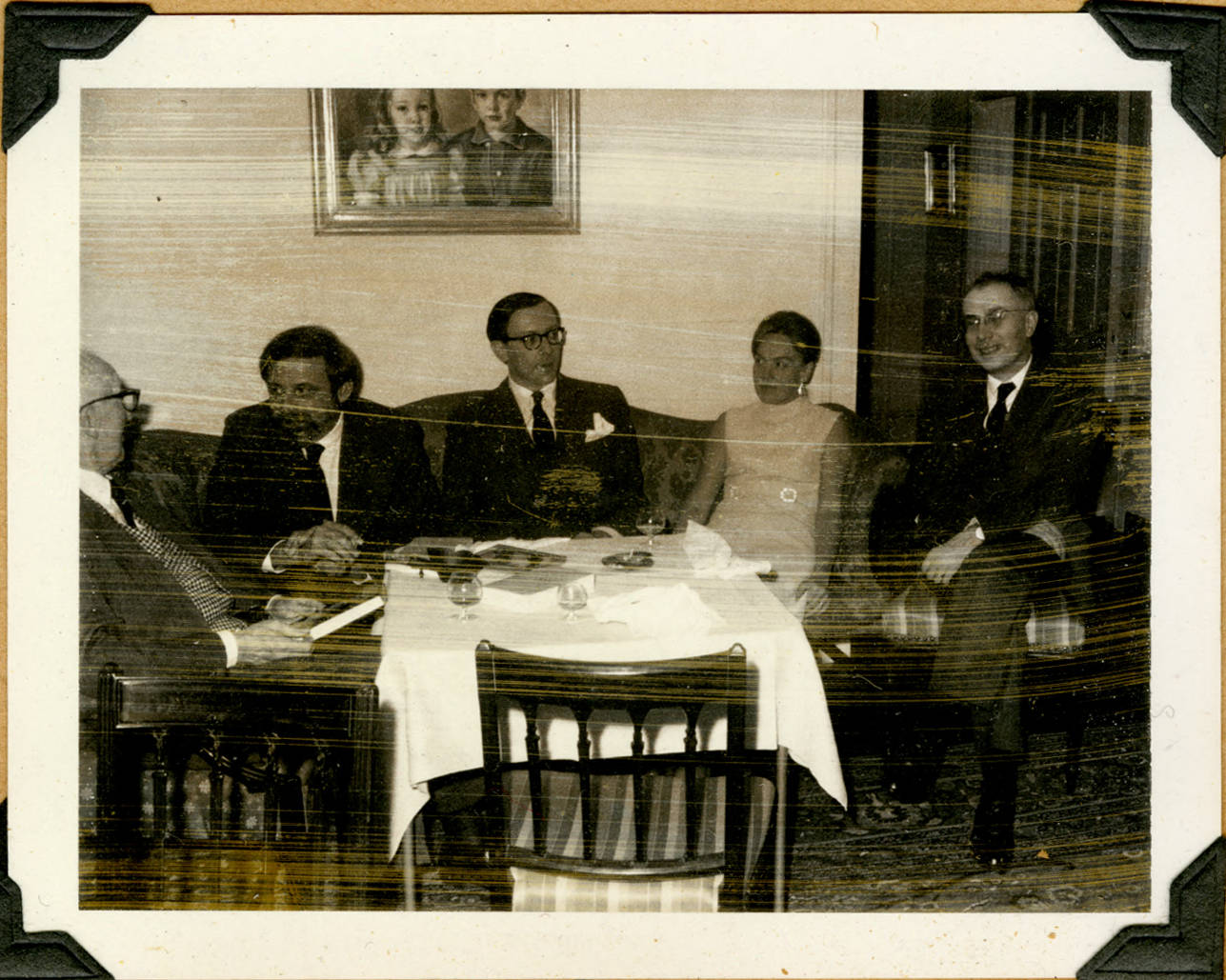 After a symposium honoring Salomon Bochner, (l. to r.) the host, Raoul Bott, Robert C. Gunning, Brita Dolph, and Paul Malliavin dine at the home of Louise and Marston Morse.