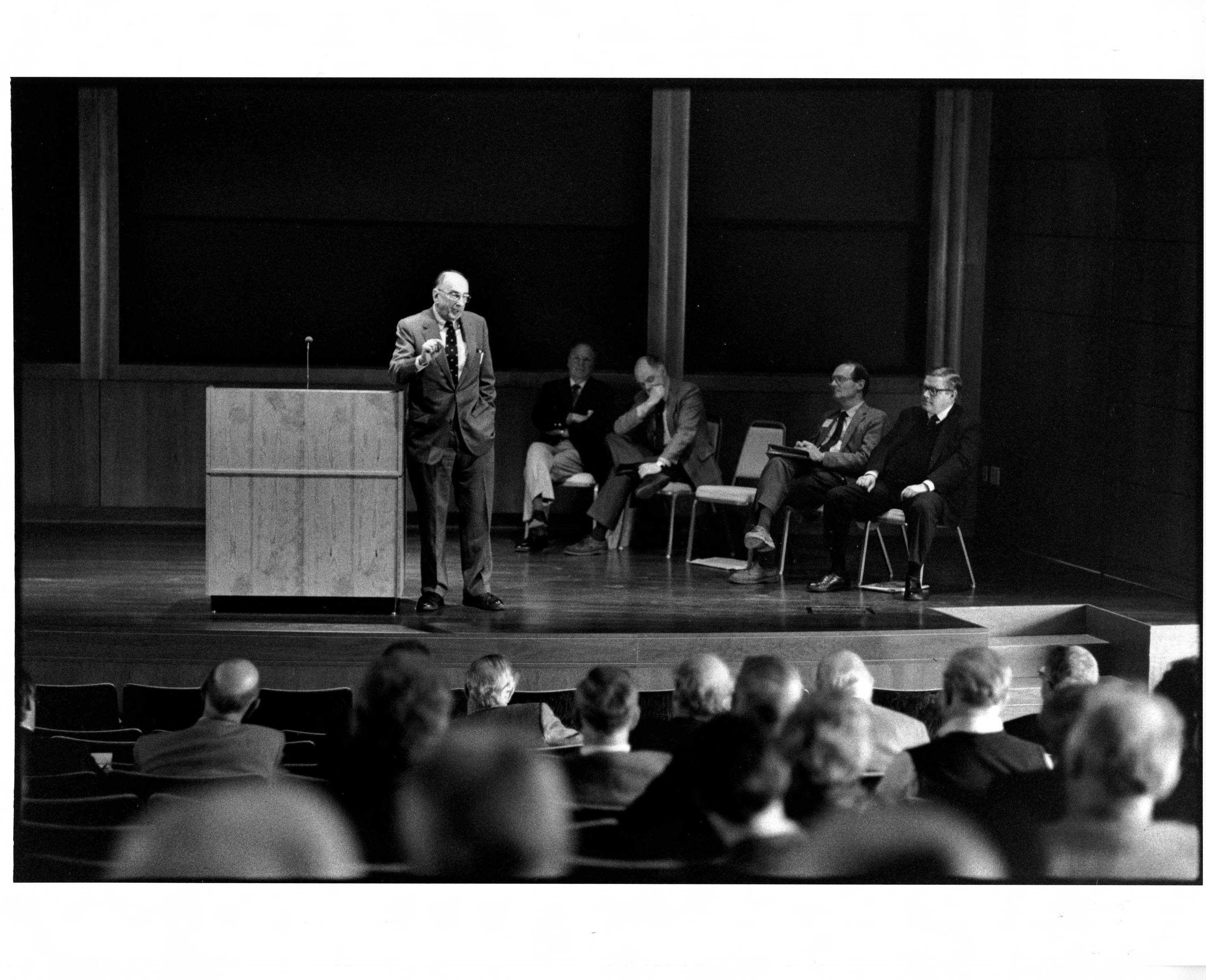 Peter Paret (seated, on stage, second from left) and unidentified others at the March 12-13, 1993, conference held at the Institute for Advanced Study on "The History of War as Part of General History." School of Historical Studies Faculty member Paret chaired the conference.