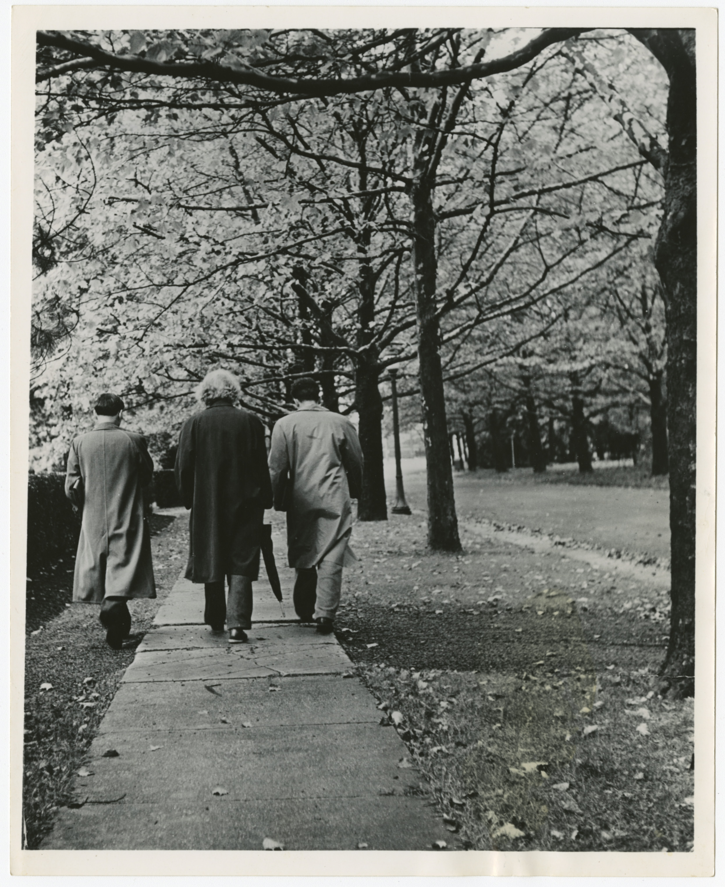 Albert Einstein with Peter Bergmann and Valentine Bargmann on the Princeton University campus