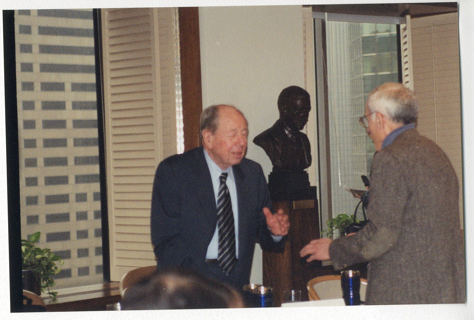 Attending an unidentified event featuring Juan Maldacena, School of Natural Sciences Faculty member, as the speaker are IAS affiliates including Trustees, Faculty, and Staff. Ralph Hansmann (center facing), IAS Trustee, speaks here with School of Natural Sciences Faculty member Stephen Adler (back to camera).