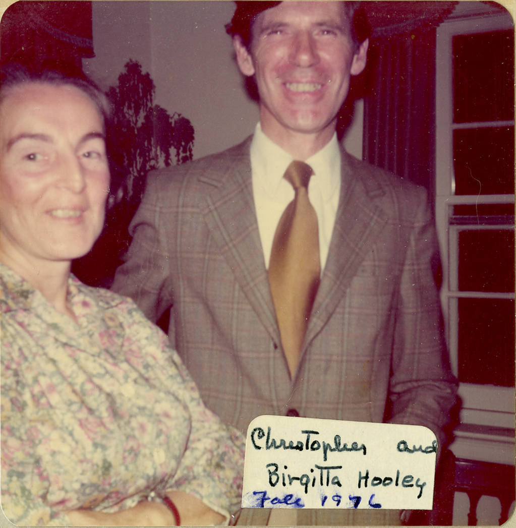 Attending a social gathering at the home of Louise and Marston Morse are Birgitta and Christopher Hooley. Most of those attending this event are affiliated with the Institute's School of Mathematics.