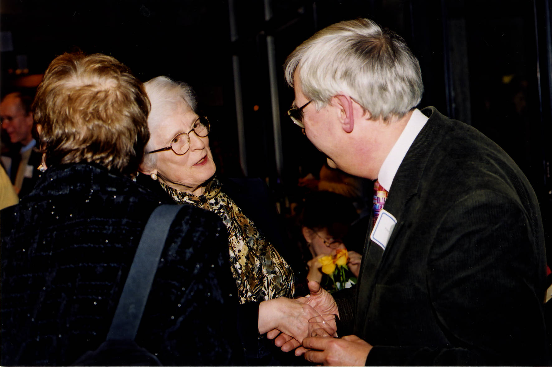 Attending the spring term reception to welcome newly arriving Members and Visitors in Marilyn and James Simons Hall on the Institute campus is Institute Director Peter Goddard (r.) greeting Terry Grabar. School of Historical Studies Member Froma Zeitlin has her back to the camera.