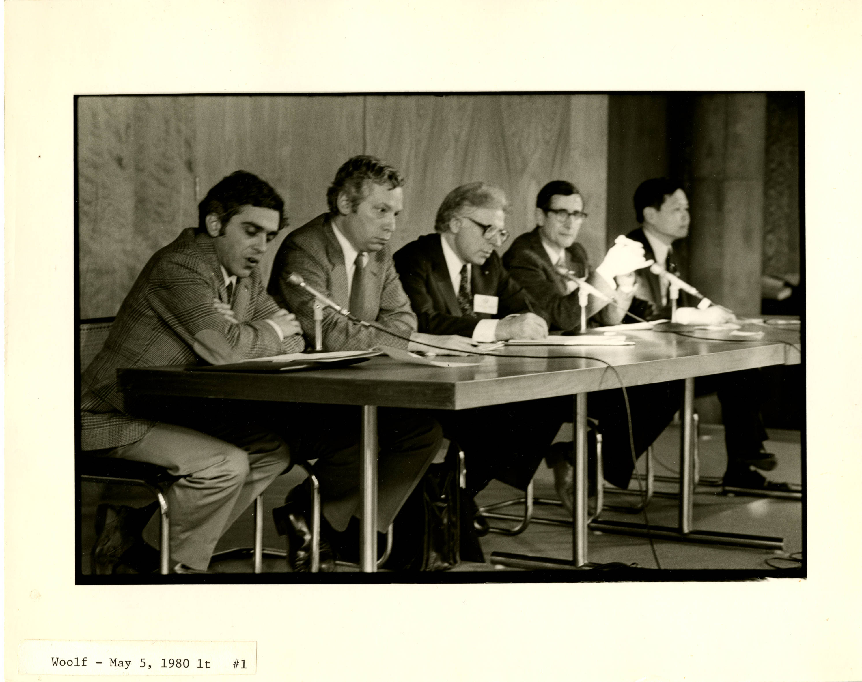 Participants in the Einstein and the Physics of the Future panel including, left to right: Stephen Adler, Steven Weinberg, Marvin Goldberger, Freeman Dyson, and C. N. Yang