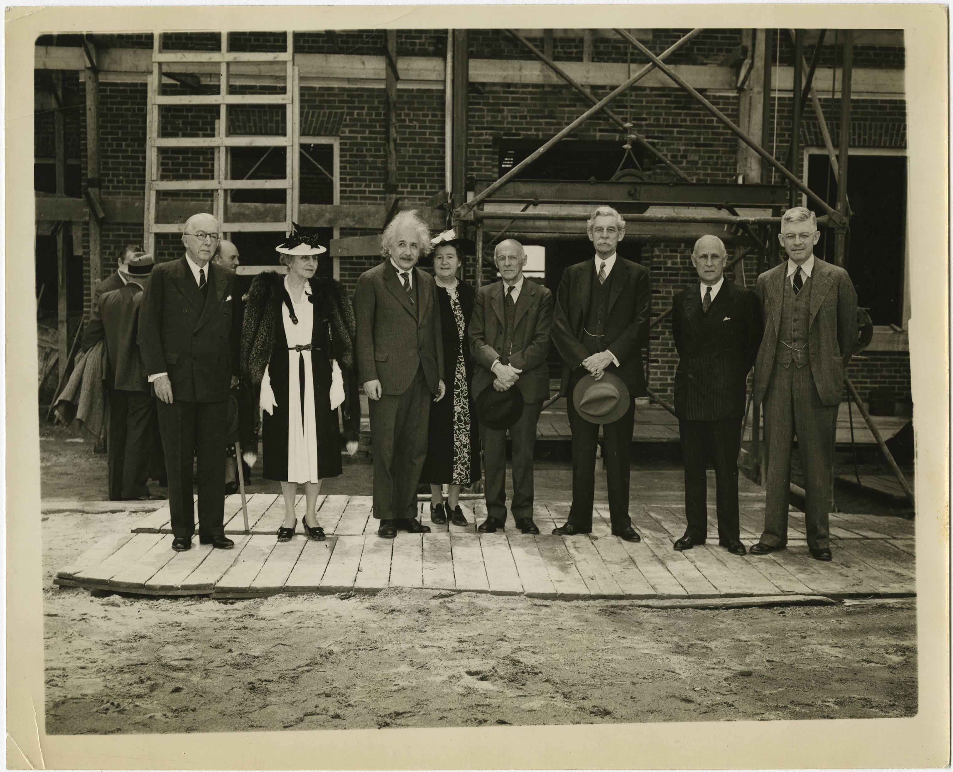 Attending the ceremony held to lay the Fuld Hall cornerstone are (from l. to right): Alanson B. Houghton (IAS Trustee), C. Lavinia Bamberger (sister of IAS founders and benefactors, Louis Bamberger and Caroline (Carrie) Bamberger Frank Fuld ), Albert Einstein, Anne Crawford Flexner (wife of Abraham Flexner), Abraham Flexner (IAS Director), John R. Hardin (IAS Trustee), Herbert Maass (IAS Trustee), Harold W. Dodds (President, Princeton University). Fuld Hall was the first building constructed on the Institute for Advanced Study campus.