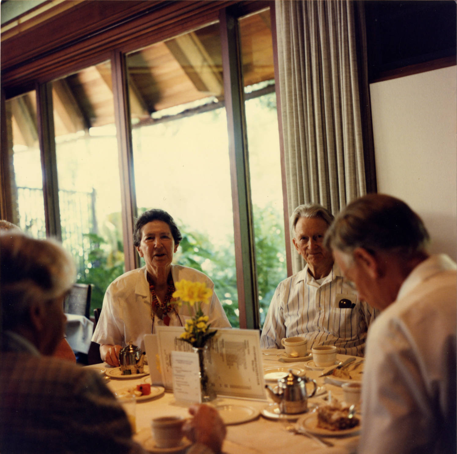Atle Selberg having lunch at the Stanford Faculty Club at Stanford University in California. His first wife, Hedi, is seated to his right. The other people at the table have not been identified. One of a series of photographs taken during this visit.