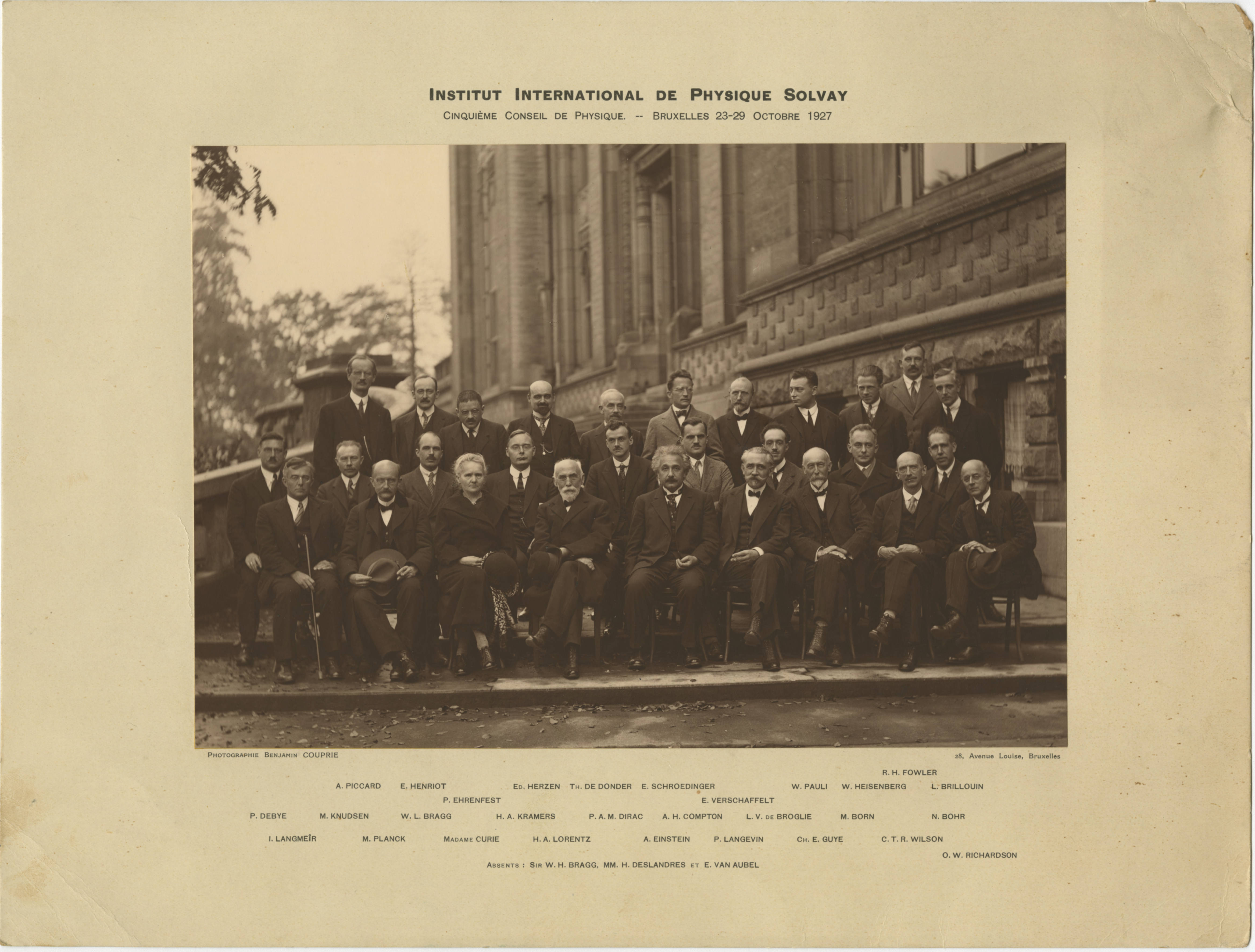 Group photograph of the scholars, including Albert Einstein, who attended the fifth Institut International de Physique Solvay, which was held in Brussels, Belgium, from October 23-29, 1927. Pictured, from left to right, are: (first row): Irving Langmuir, Max Planck, Marie Curie, Hendrik Antoon Lorentz, Albert Einstein, Paul Langevin, Charles-Eugène Guye, Charles Thomson Rees Wilson, Owen Willans Richardson