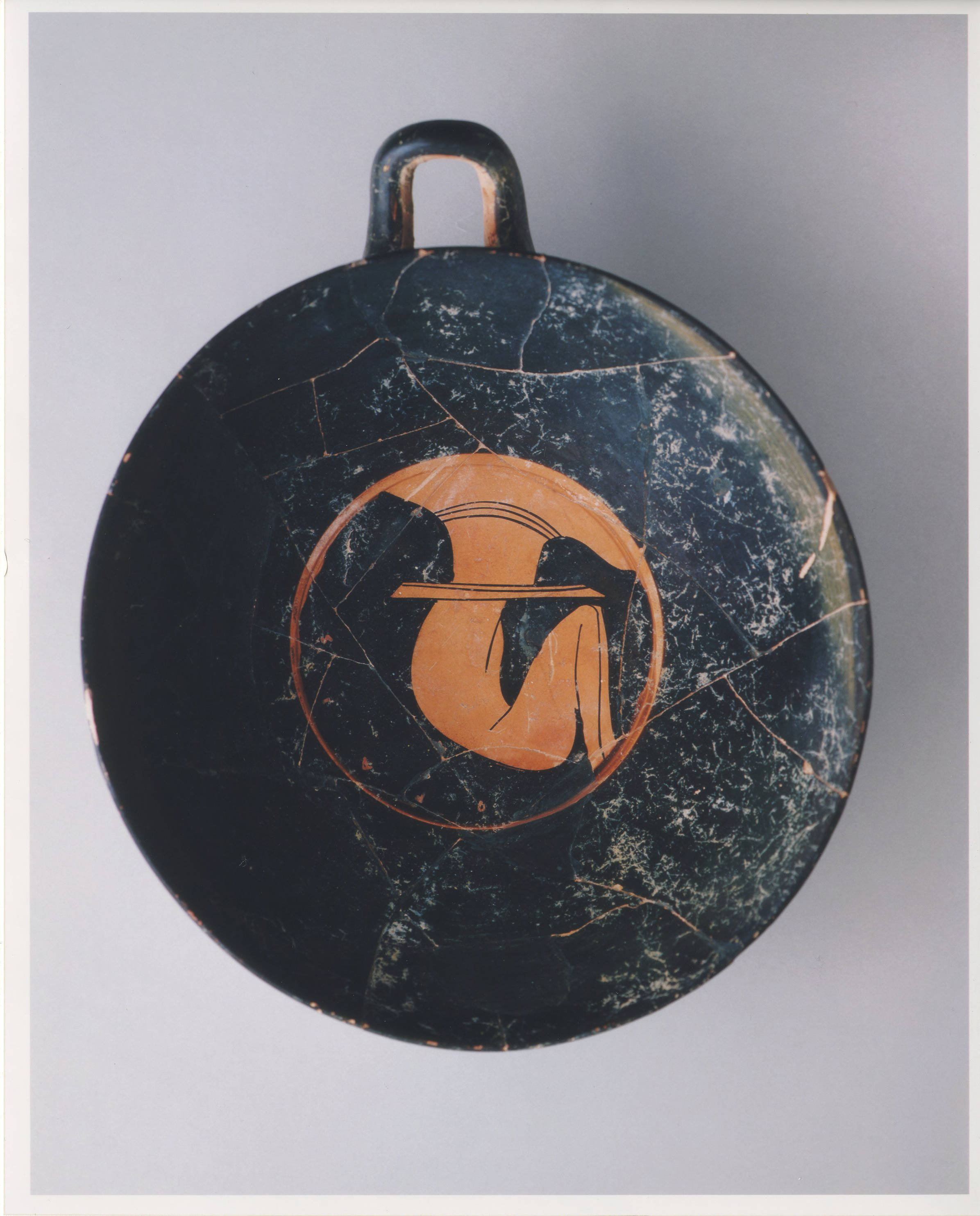 Red-figured cup featuring Glaukos, son of King Minos, who falls into a jar of honey. In the field the greek reads the boy. Athens.