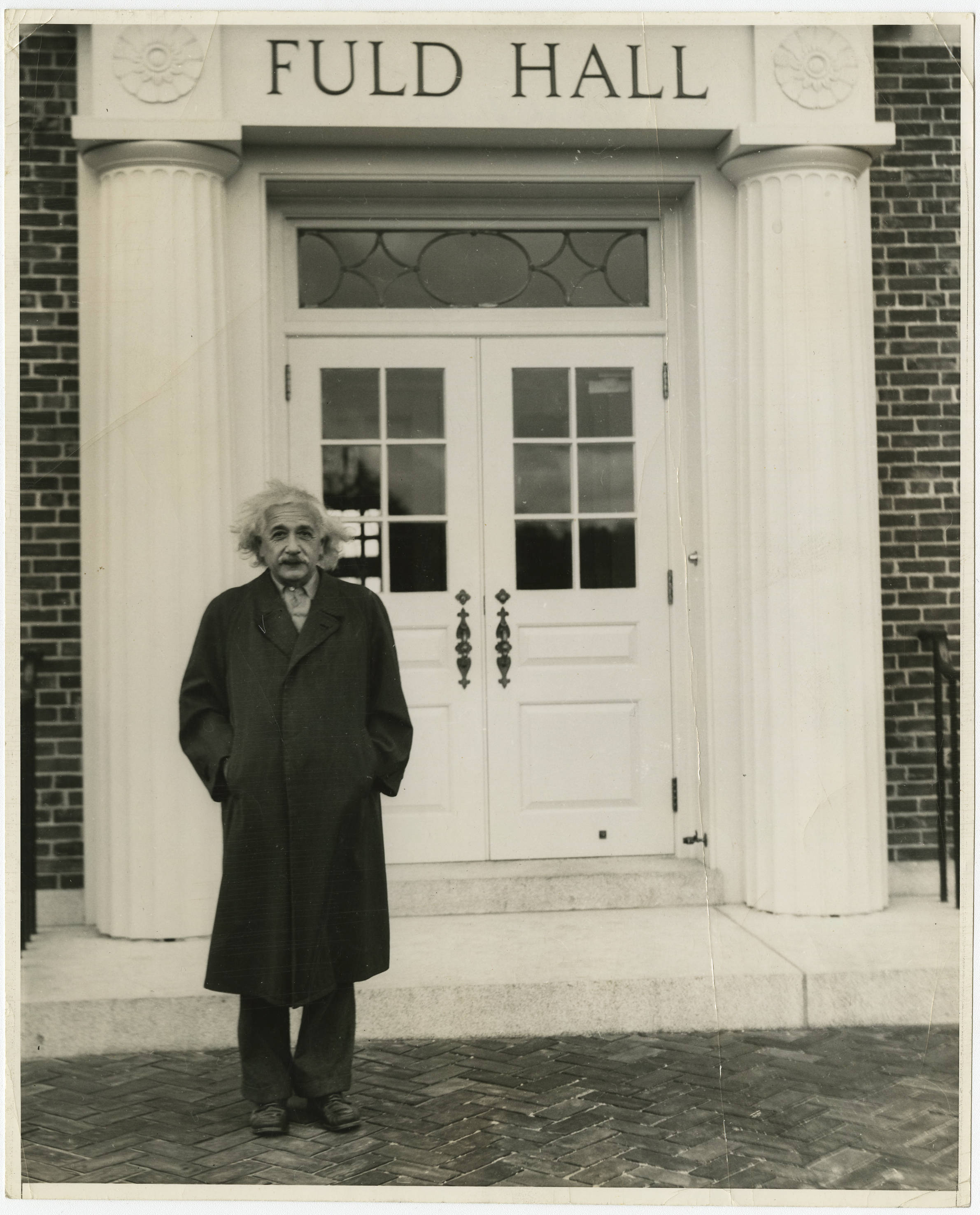 Albert Einstein standing in front of Fuld Hall on the Institute for Advanced Study campus in Princeton, New Jersey.