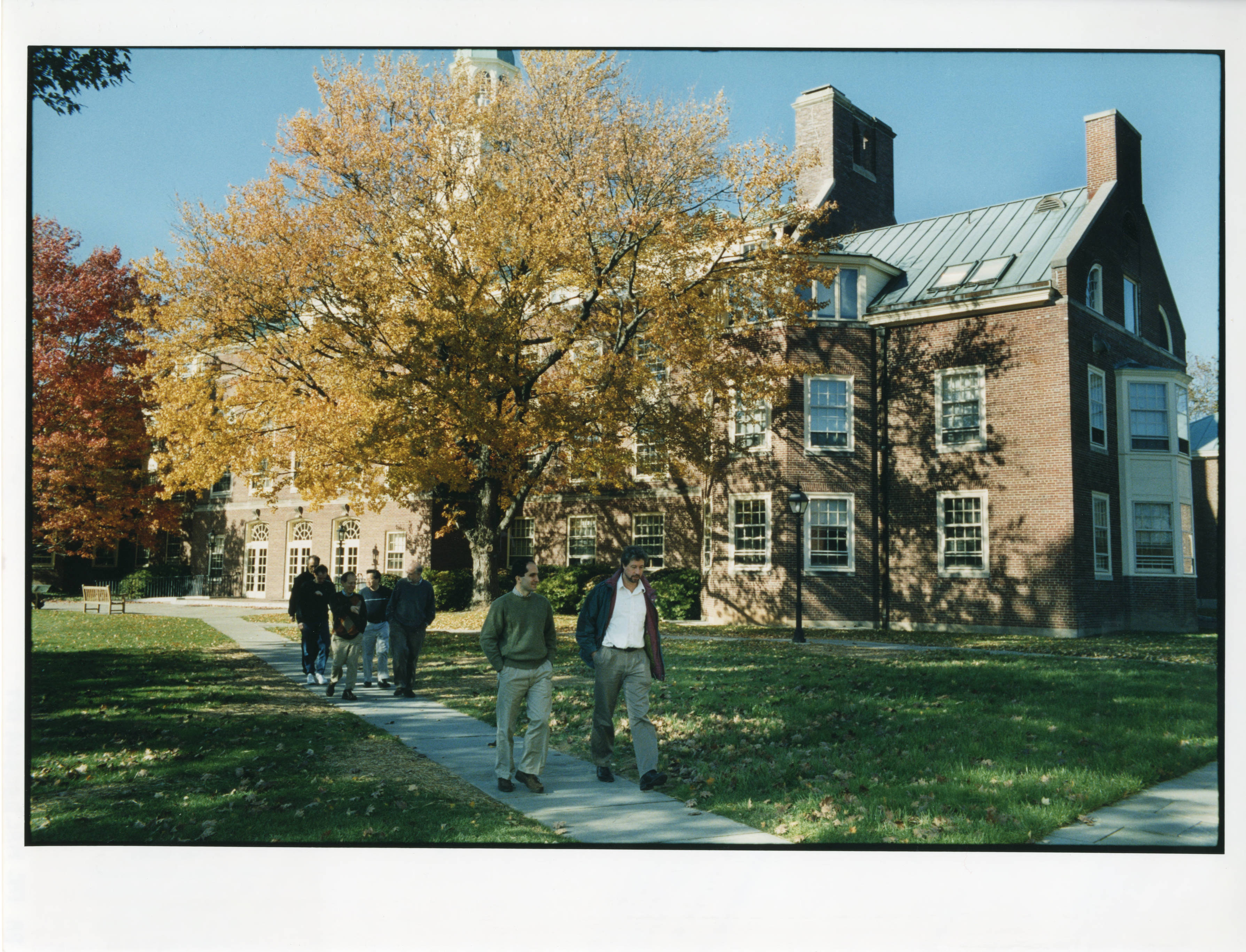 One of a series of images taken for an article published in the January 2003 issue of M, the now defunct monthly magazine of the Dutch evening newspaper, NRC Handelsblad. The article is about string theorists - mostly those at the Institute for Advanced Study (School of Natural Sciences Faculty members Juan Maldacena, Nathan Seiberg, and Edward Witten) and Princeton University. This photo features Juan Maldacena (left in foreground) walking next to Erik Verlinde across the Institute for Advanced Study campus. Edward Witten is just visible at the very back of a group of otherwise unidentified individuals. Fuld Hall is seen in the background.