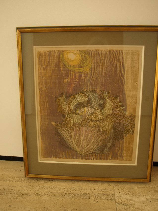 Silkscreen print( or woodcut marked 10/15; in soft colors of green and purple; object in center of print looks like an oriental cabbage with graceful leaves; at the top edge is the sun( in an abstract form.