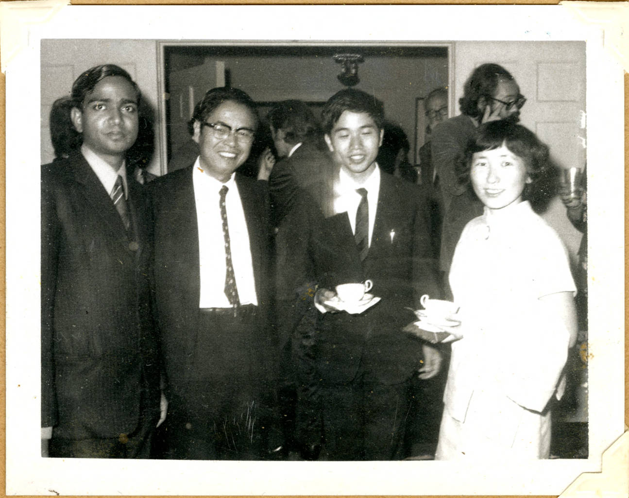 Attending a social gathering of the School of Mathematics at the home of Louise and Marston Morse are (l. to r.): Vijay K. Patodi, Kuo-Tsai Chen, and Professor and Mrs. Shigeru Iitaka. Those in the background have not been identified by Mrs. Morse, but other photographs that appear to have been taken on the same occasion suggest that the person directly behind Mrs. Shigeru Iitaka is Horst Elmar Winkelnkemper.