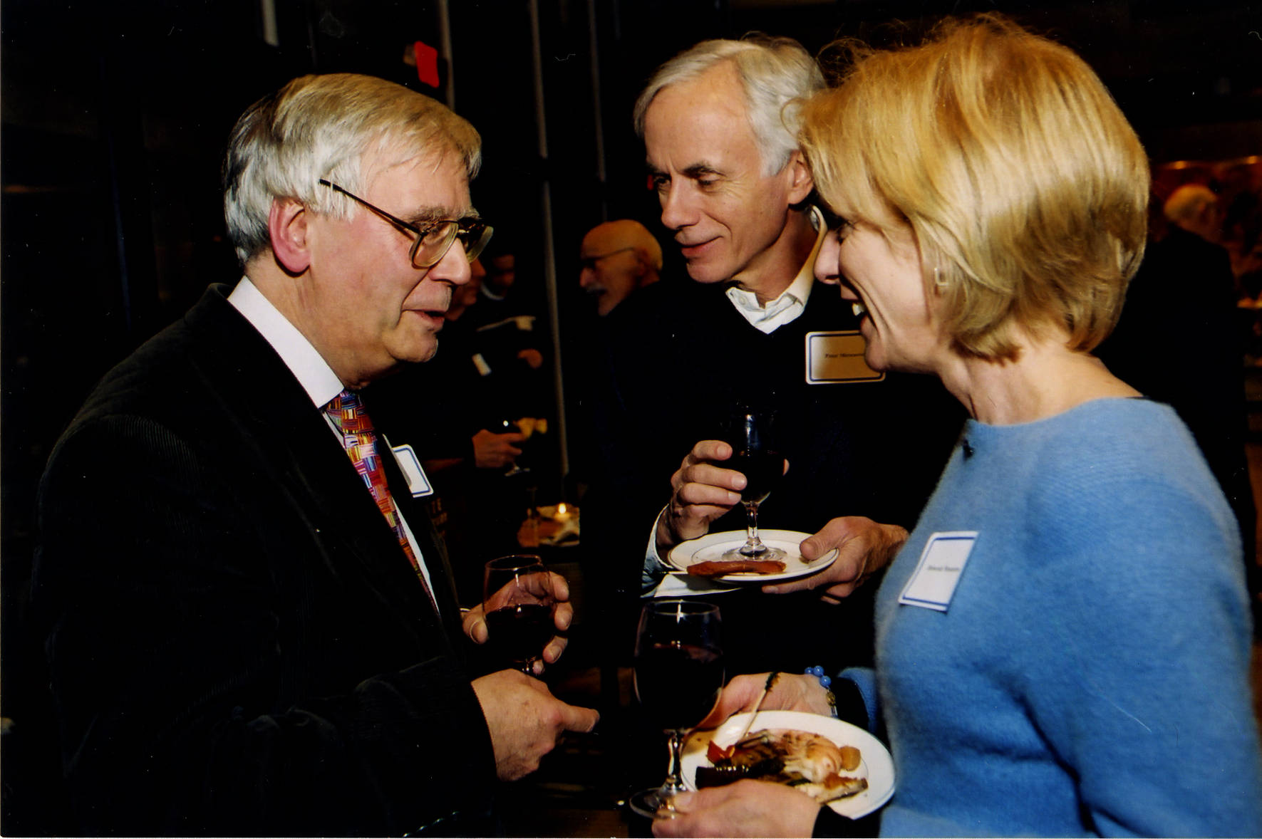 Attending the spring term reception to welcome newly arriving Members and Visitors in Marilyn and James Simons Hall on the Institute campus is Institute Director Peter Goddard (l.) with an unidentified couple.