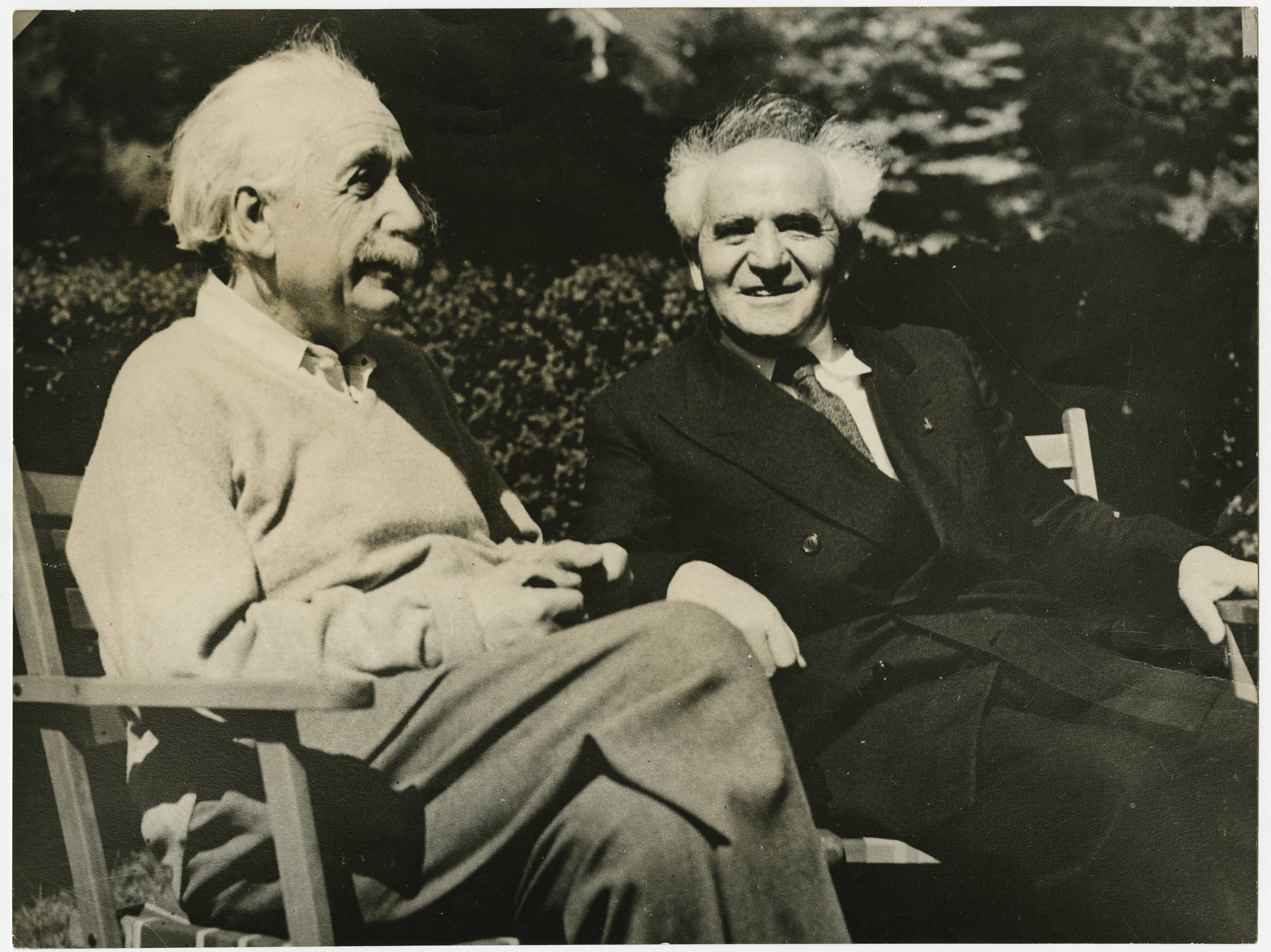 Albert Einstein and David Ben-Gurion sitting the backyard of Einstein's home (112 Mercer Street, Princeton, New Jersey).